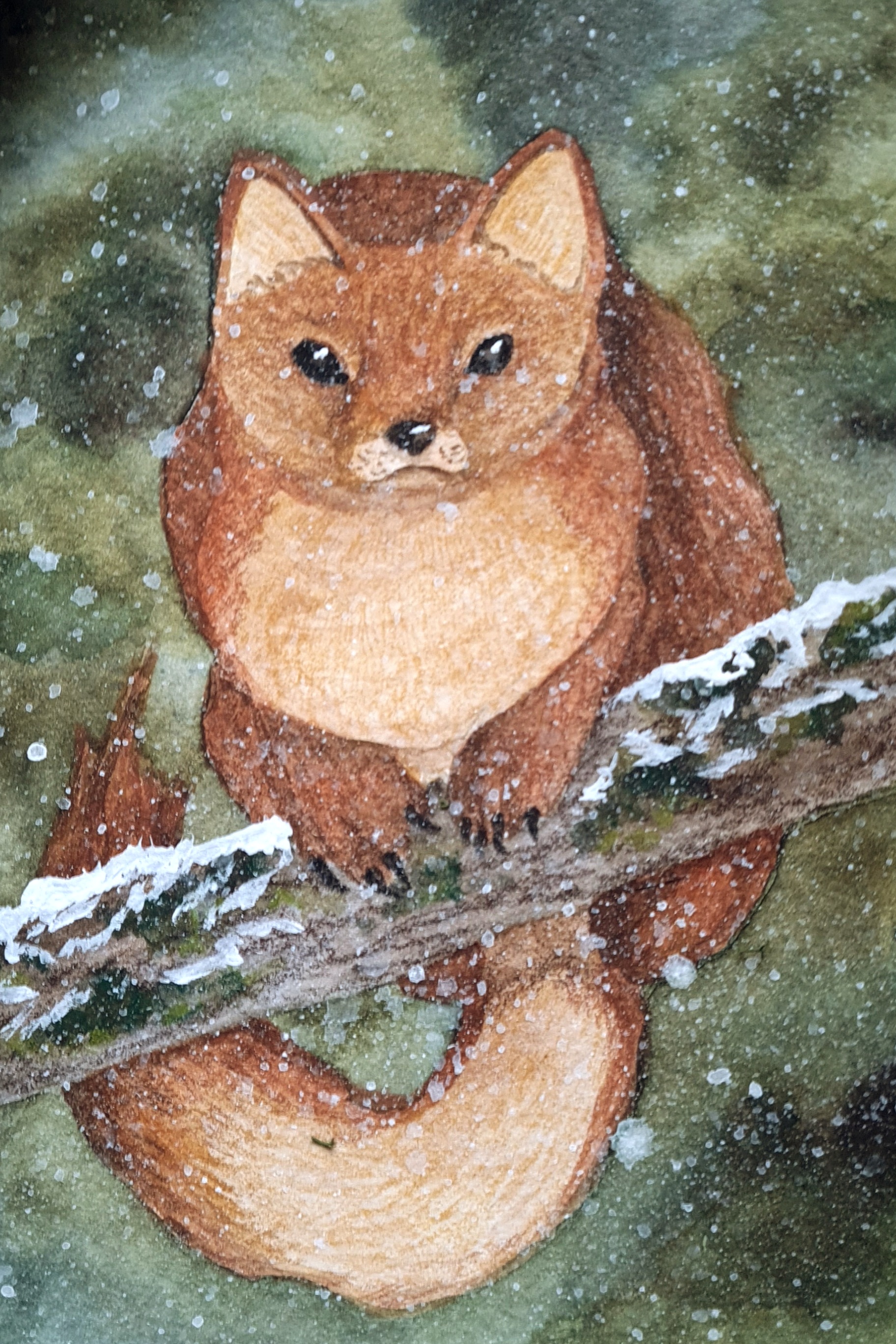 Соболь на фоне таёжной хвои и кружащиеся снежинки