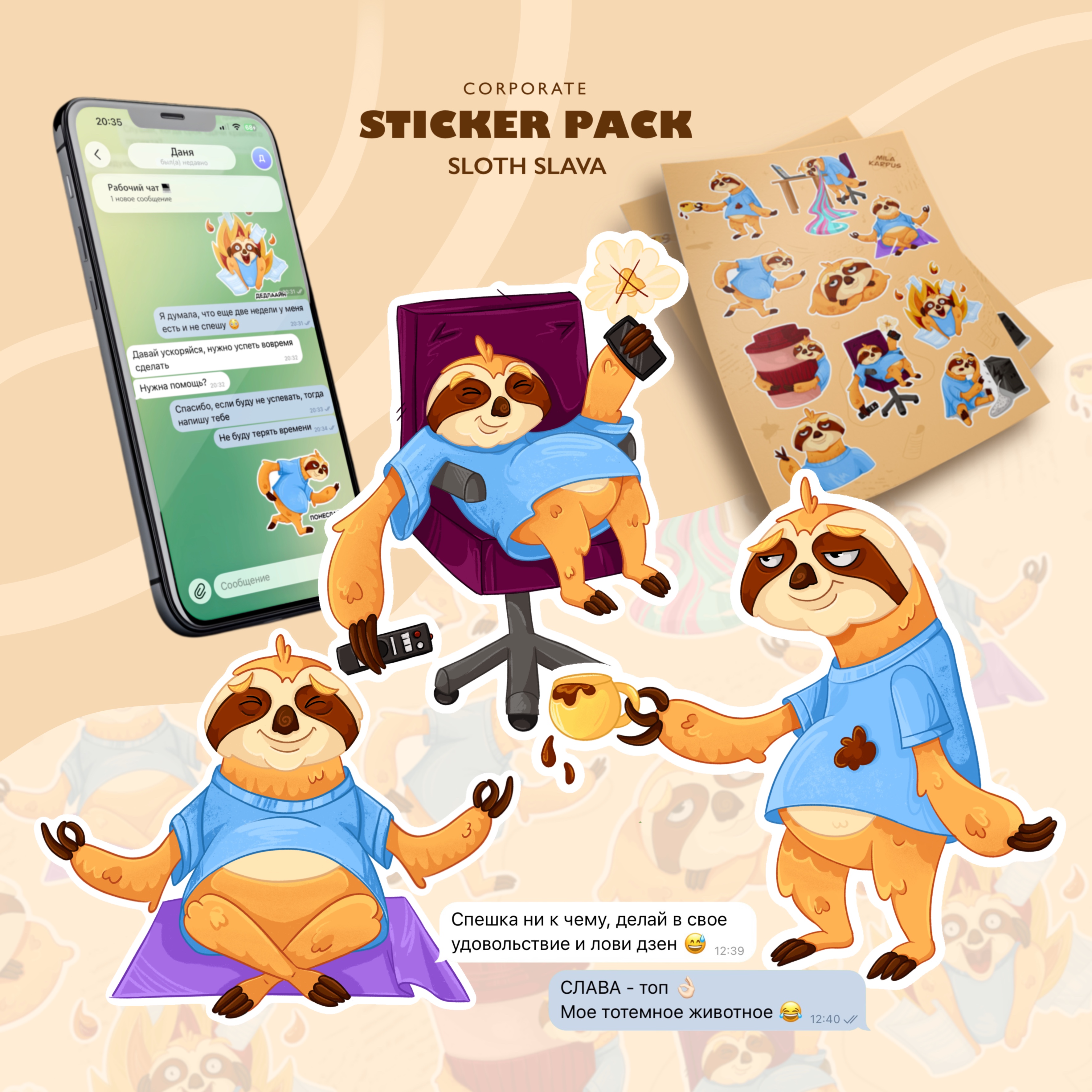 Стикерпак "Ленивец Слава"