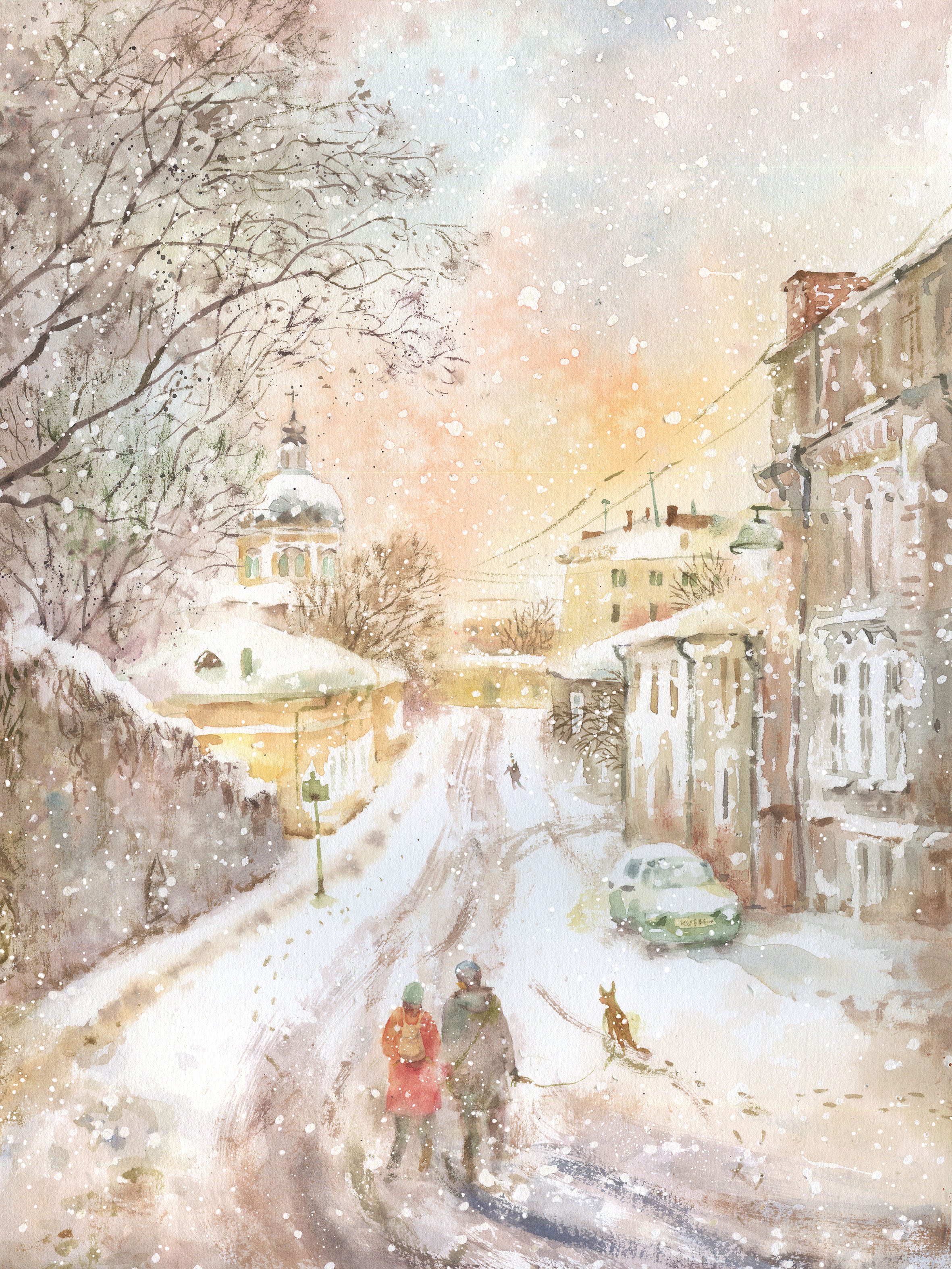 Акварель с зимним московским пейзажем, фигурами и собачкой.
