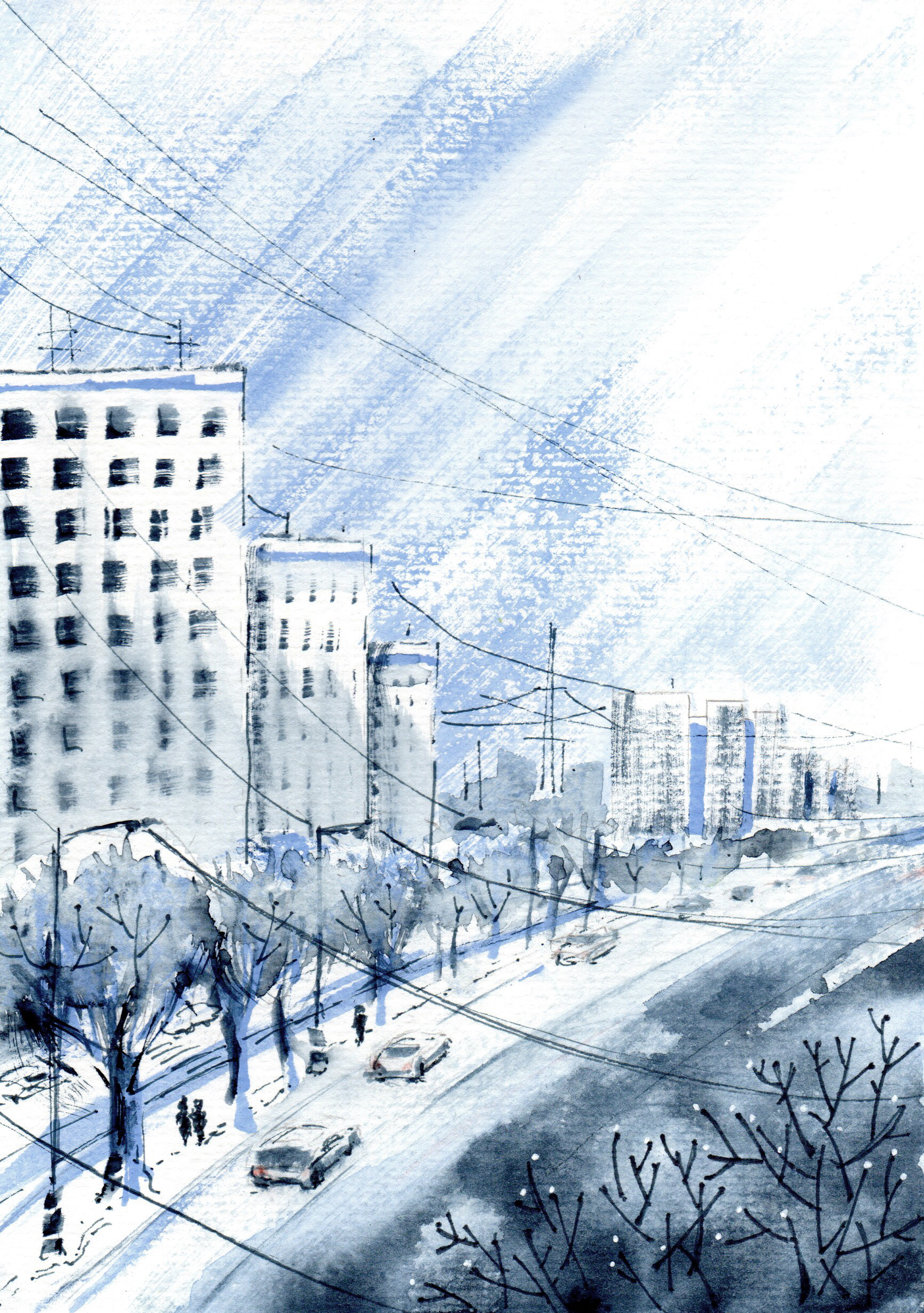 Линер, акварель, сухая кисть