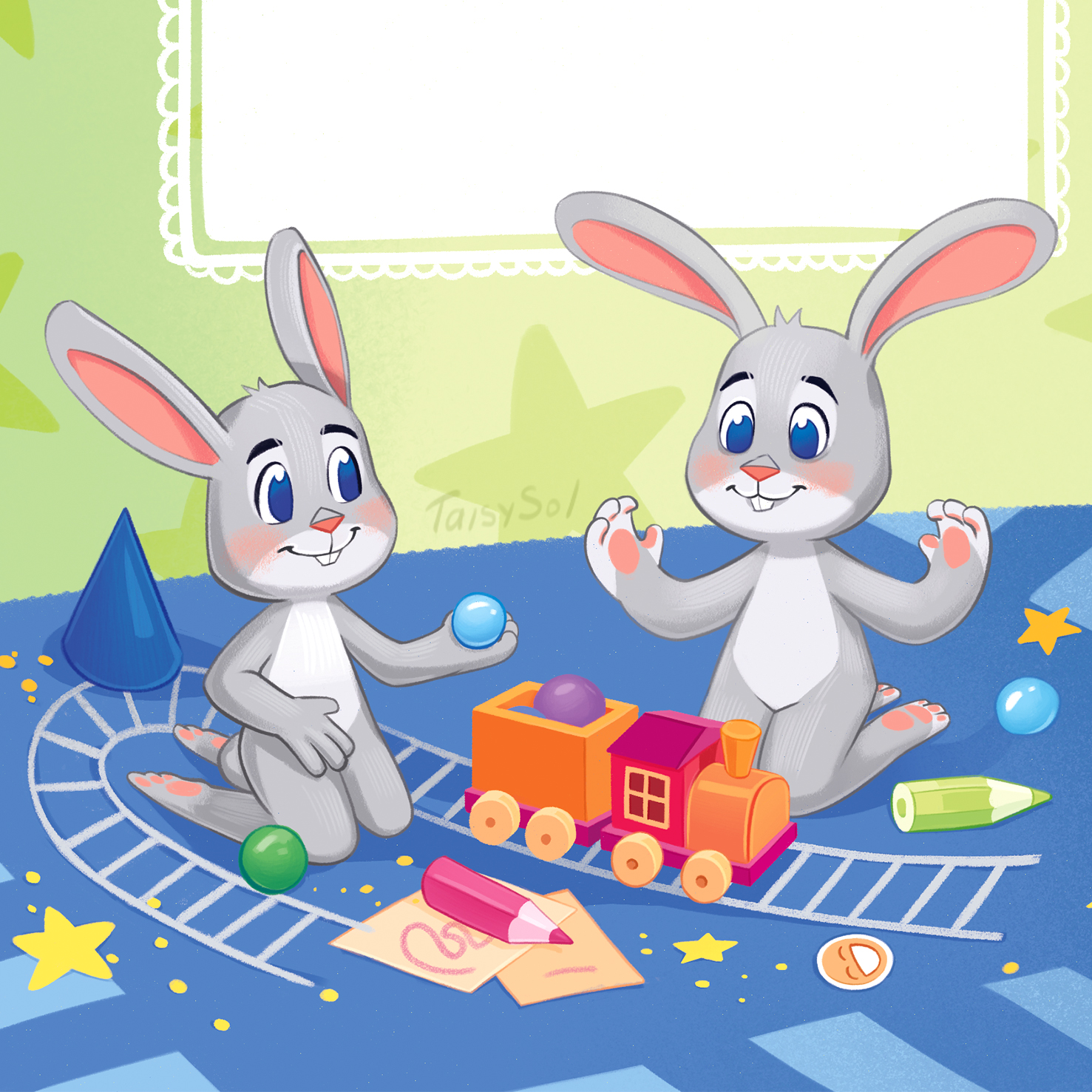 Зайчики за игрой. Иллюстрация для книжки-малышки.