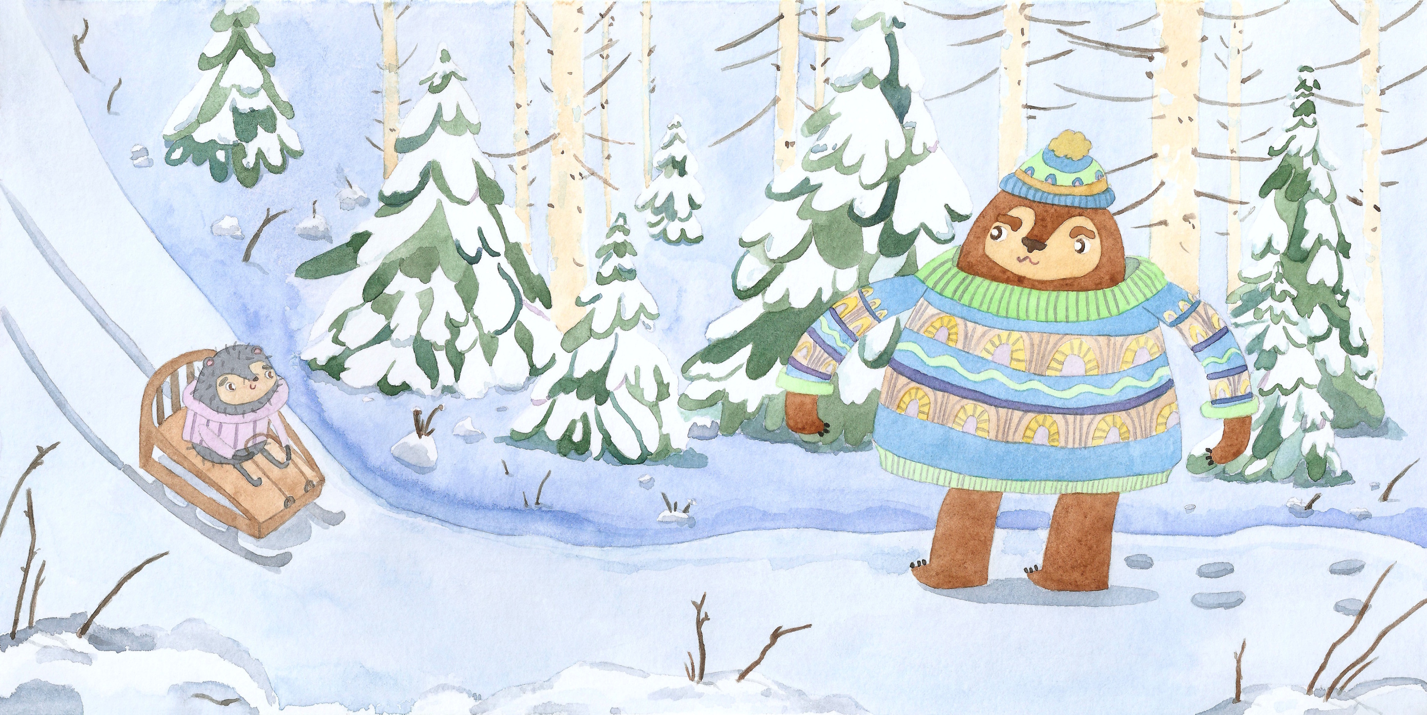 Медведь Январик и ёжик Якушка в зимнем лесу
