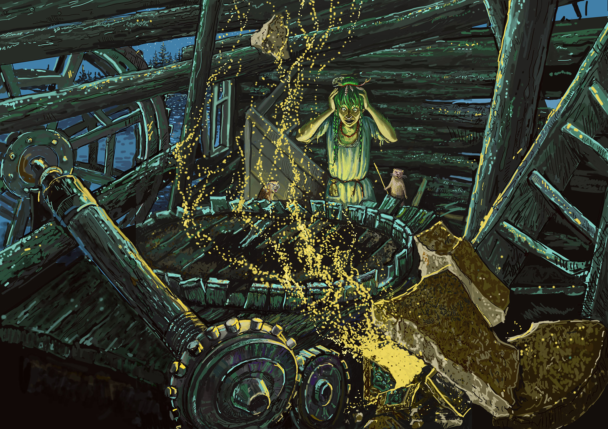После "большого" взрыва мельница рассыпалась. Кикимора с ужасом смотрит как разлетается звёздная пыль. Сказка Евгения Бедарева "Успеть до восхода солнца".