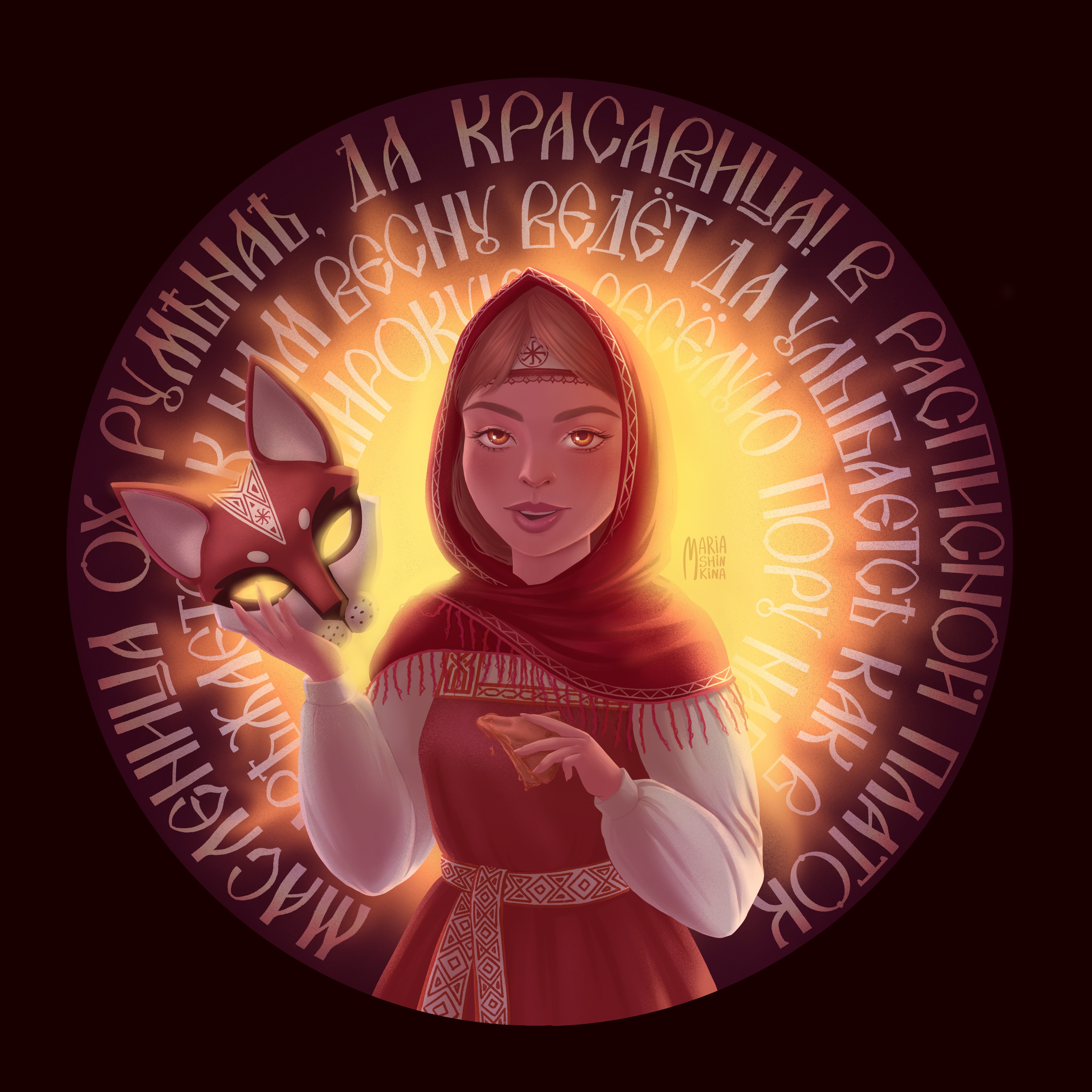 Иллюстрация к масленице. Красивая девушка с маской лисы на празднике встречи весны. Огонь, блины и солнце.