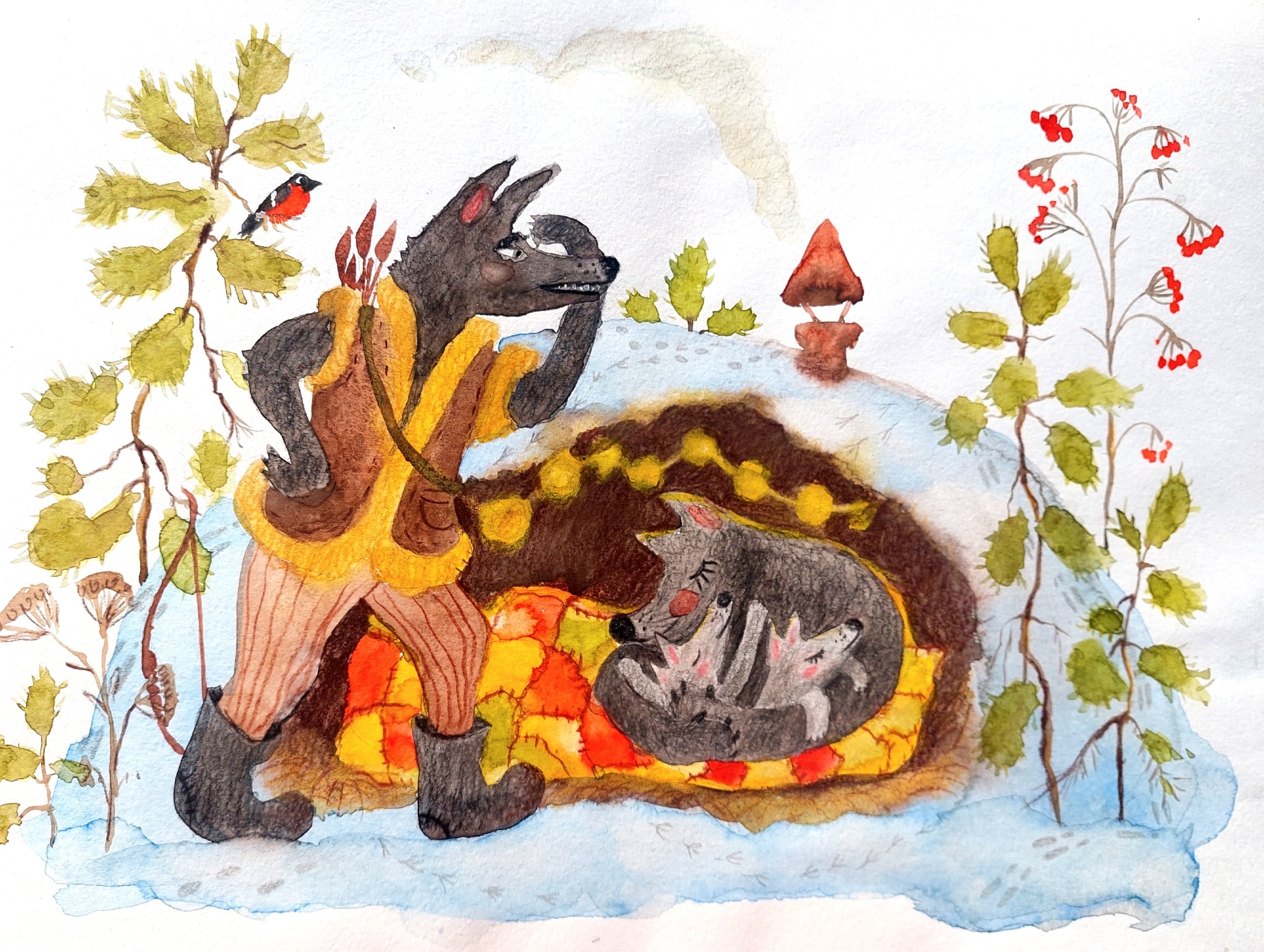 Волк, хозяин семьи, охраняет свою волчицу и волчат.