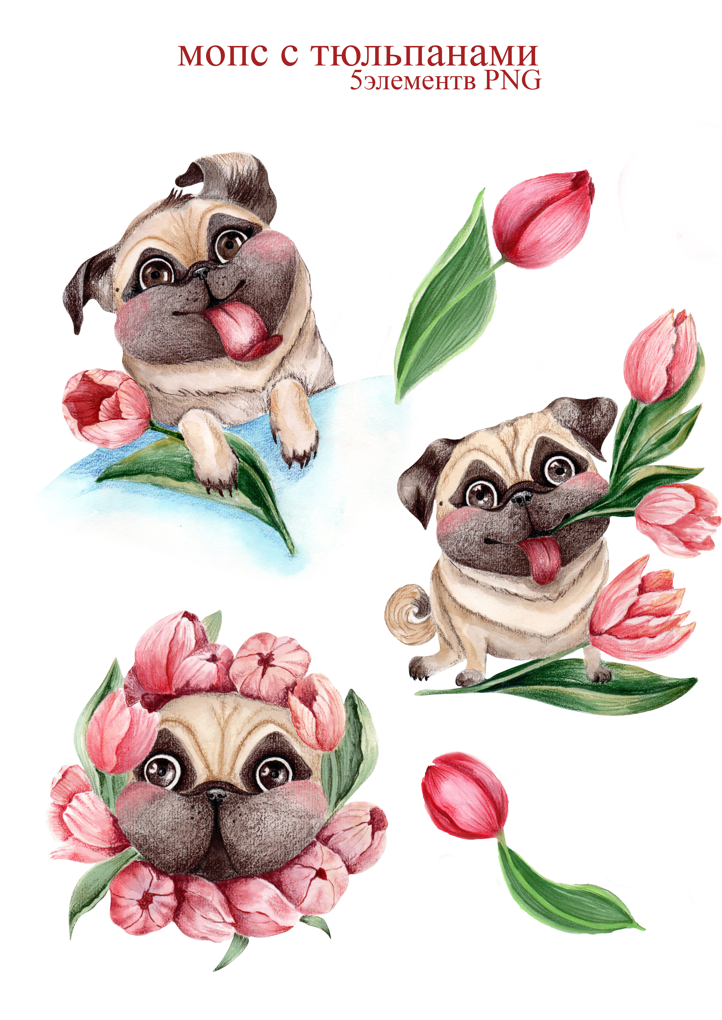 мопс с тюльпанами