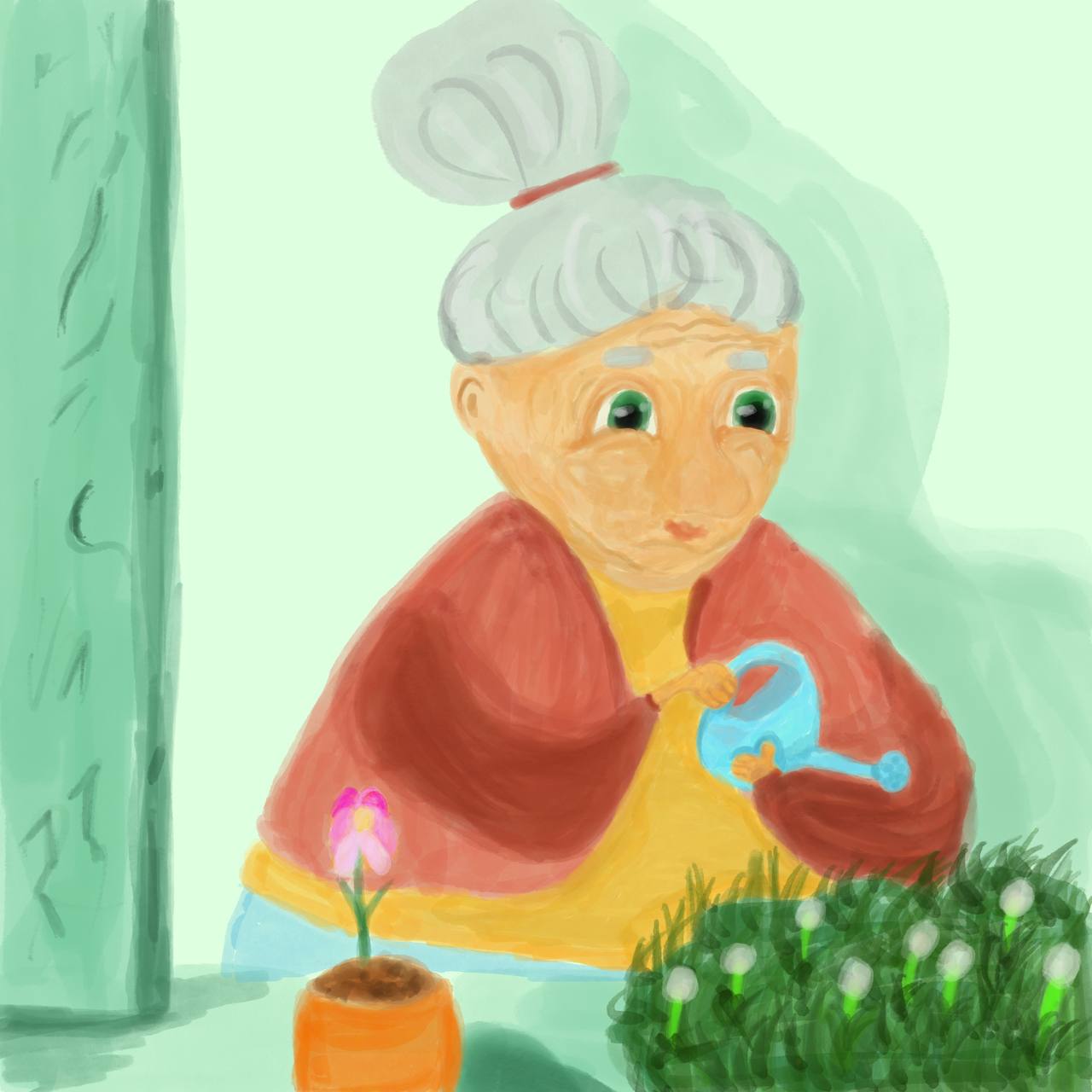 Бабушка поливает цветы