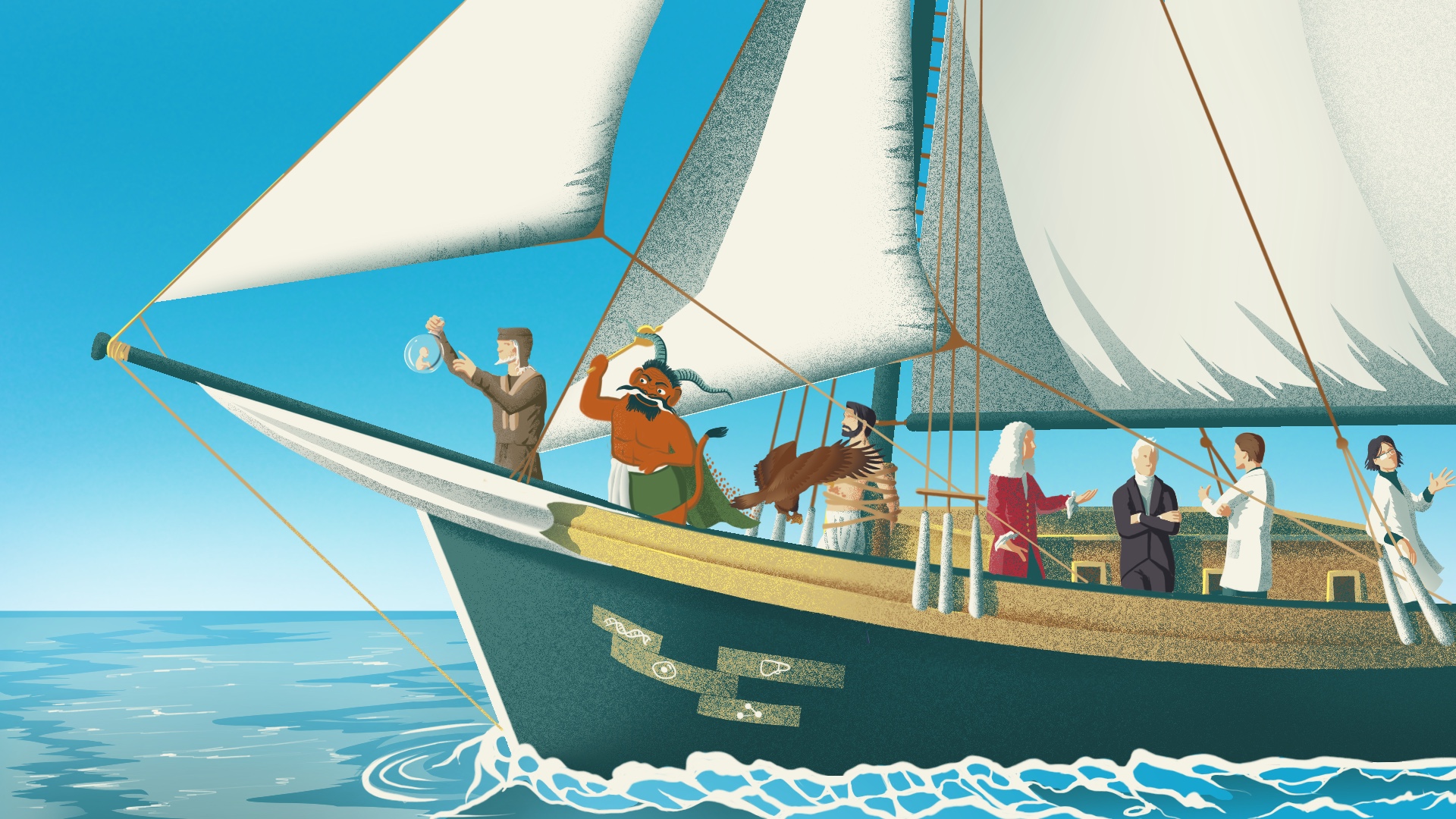 Основные герои истории развития регенеративной медицины, плывущие на корабле Тесея, от пионеров до современных исследователей