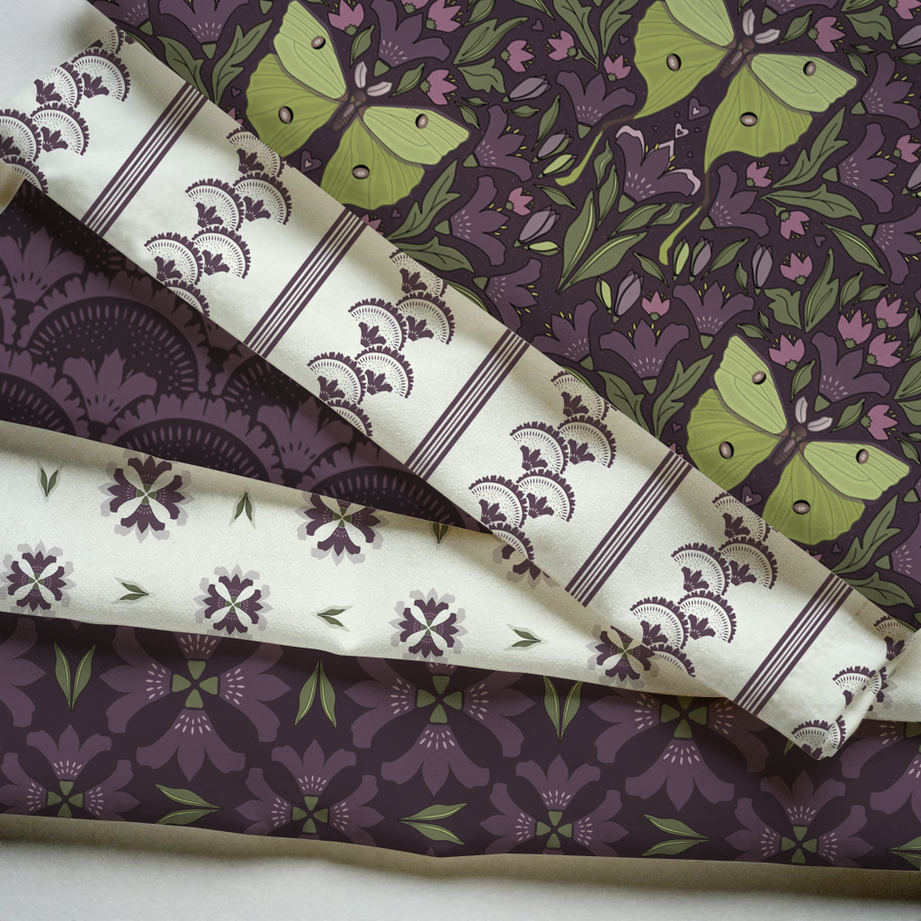 Набор бесшовных иллюстраций из Коллекции "Мадагаскарская комета". В наборе 5 иллюстрации на темно лиловом и молочном фоне (также есть на т. лиловом, салатовом, молочном и с. розовом) для печати на ткани, обоях, канцтоварах и др.