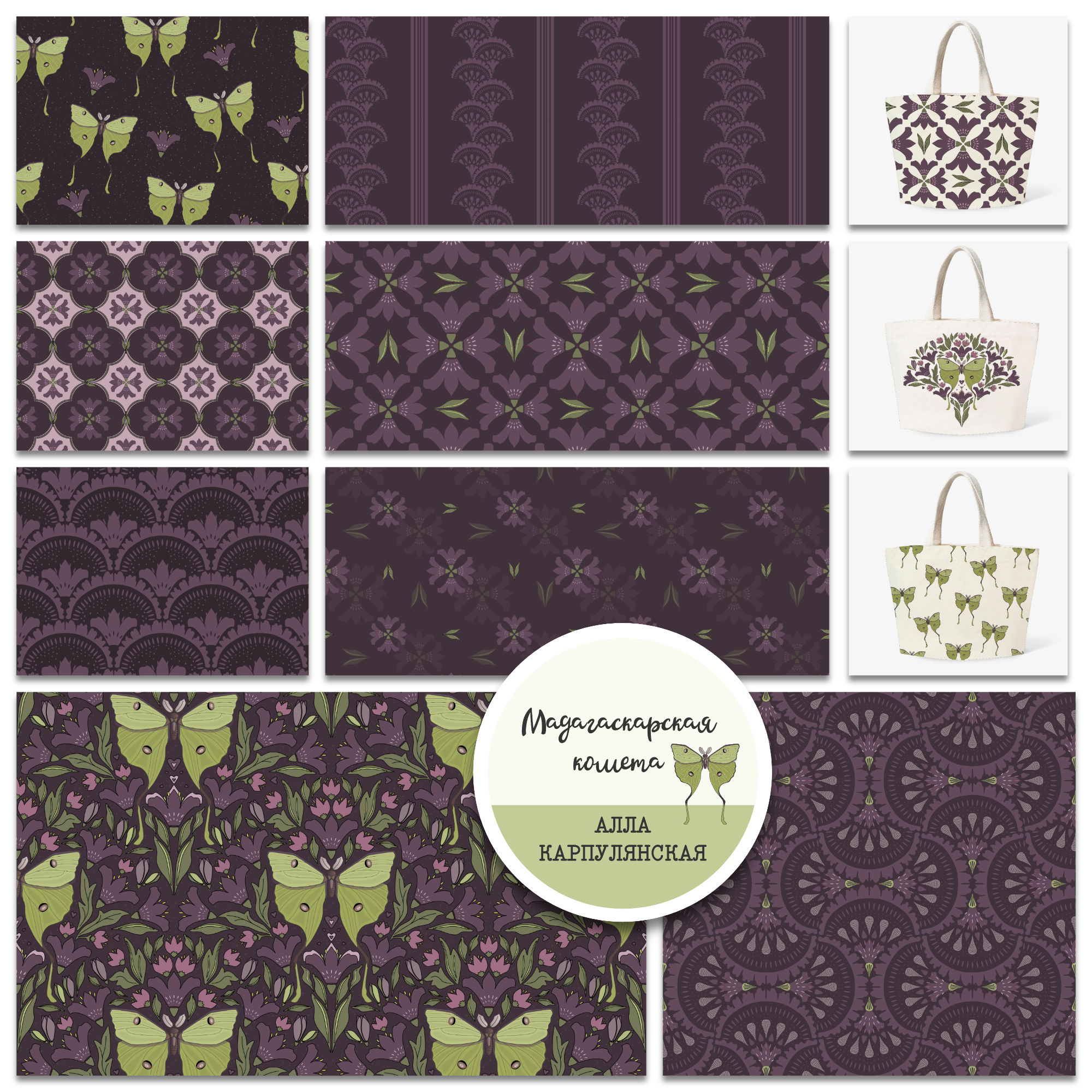 Набор бесшовных иллюстраций из Коллекции "Мадагаскарская комета". В наборе 8 иллюстрации на темно лиловом фоне (также есть на т. лиловом, салатовом, молочном и с. розовом) для печати на ткани, обоях, канцтоварах и др.