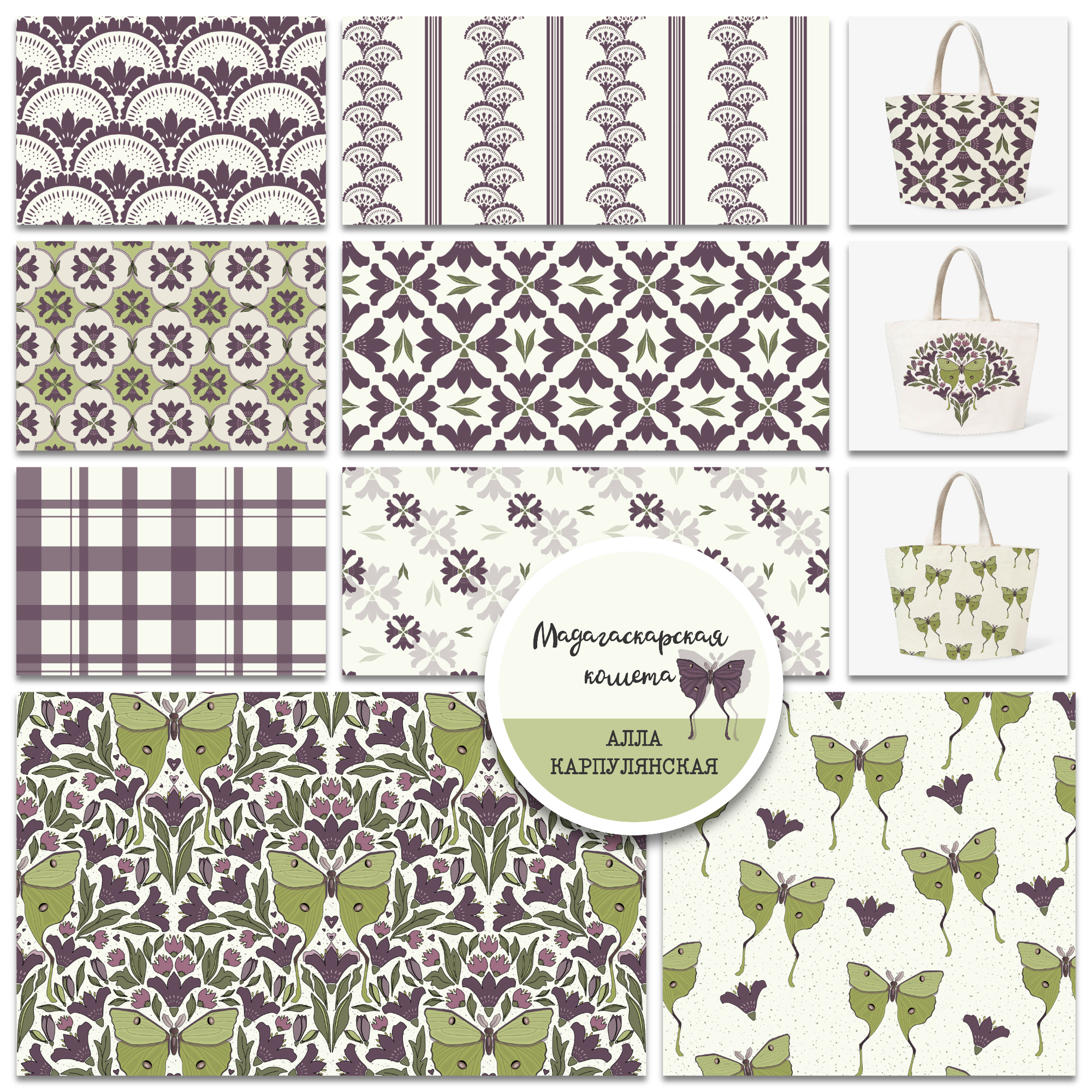 Набор бесшовных иллюстраций из Коллекции "Мадагаскарская комета". В наборе 8 иллюстраций на молочном фоне (также есть на т. лиловом, салатовом, молочном и с. розовом) для печати на ткани, обоях, канцтоварах и др. Иллюстрации в формате png в размере 30*30см или 3600*3600 pxl, по запросу jpg или векторная версия, а также больший размер.
