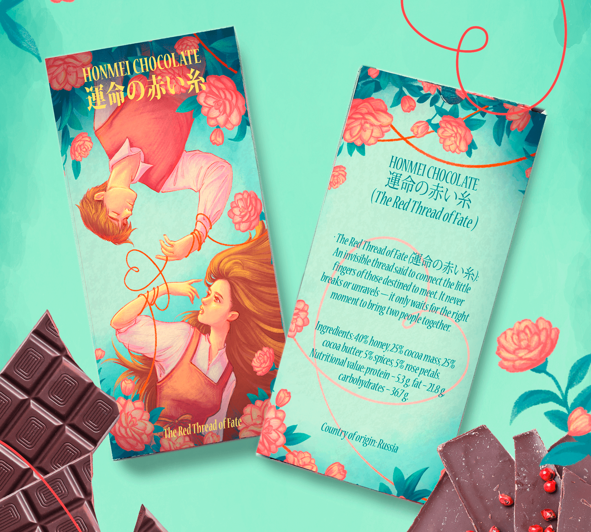Иллюстрация на день влюбленных "Красная нить судьбы". Вариант использования иллюстрации на упаковке шоколада.