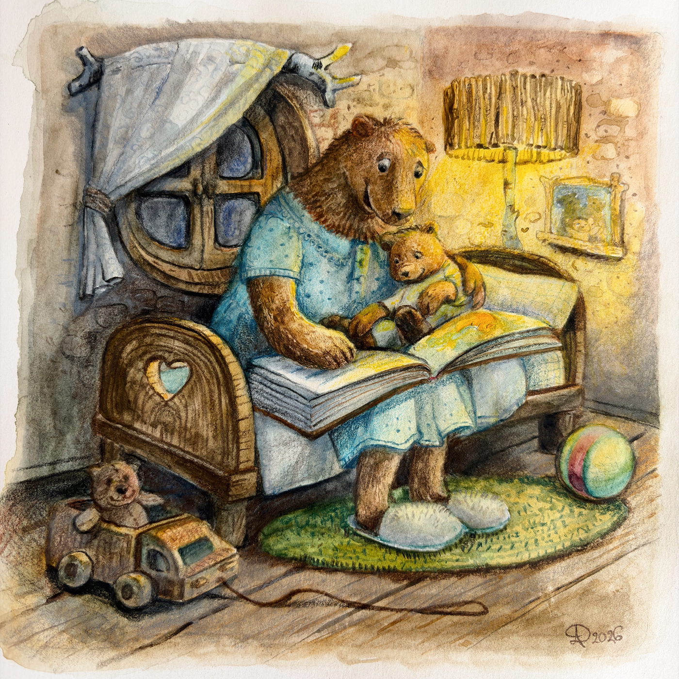 Наступил вечер. За окном уже темно, а в доме медведей уютно и тихо. Мама медведица читает своему сыночку сказку перед сном, а малыш с удовольствием ее слушает.