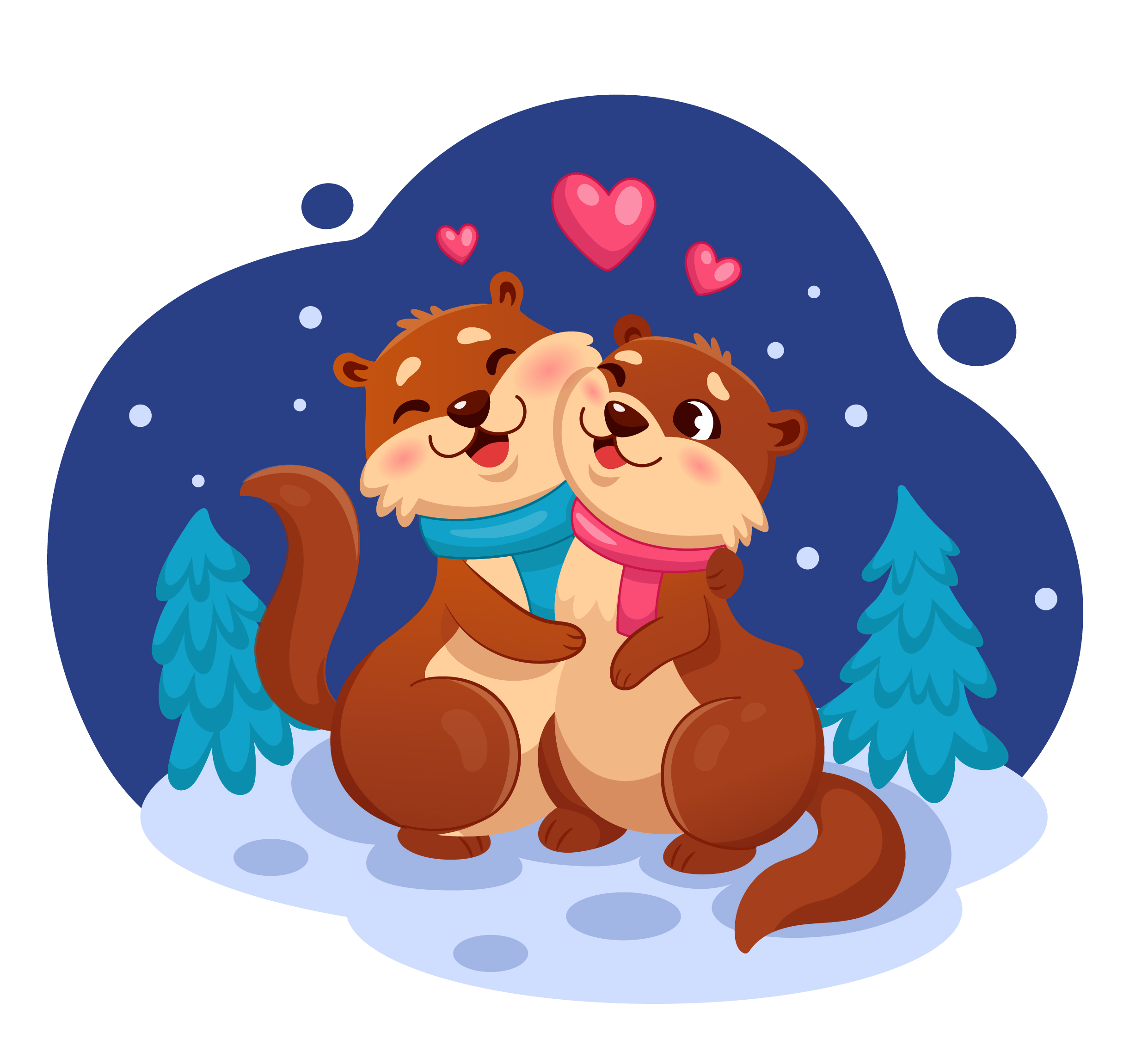 Милая зимняя иллюстрация с двумя влюблёнными выдрами, обнимающимися на фоне снежного леса. Тёплая сцена в мультяшном стиле передаёт атмосферу любви и уюта. Подойдёт для открыток ко День святого Валентина, романтических открыток и стикеров, иллюстраций для детских книг, постов и баннеров для соцсетей, дизайна упаковки и сувенирной продукции, принтов для одежды и мерча, а также постеров и декора детских комнат.