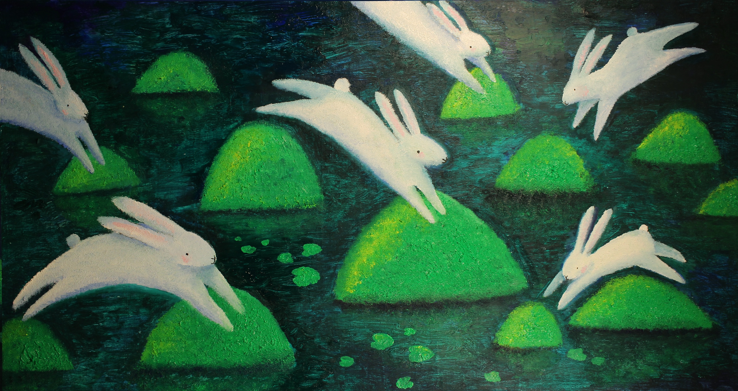 Белые зайцы прыгают по болотным кочкам (атмосферный сюрреализм)