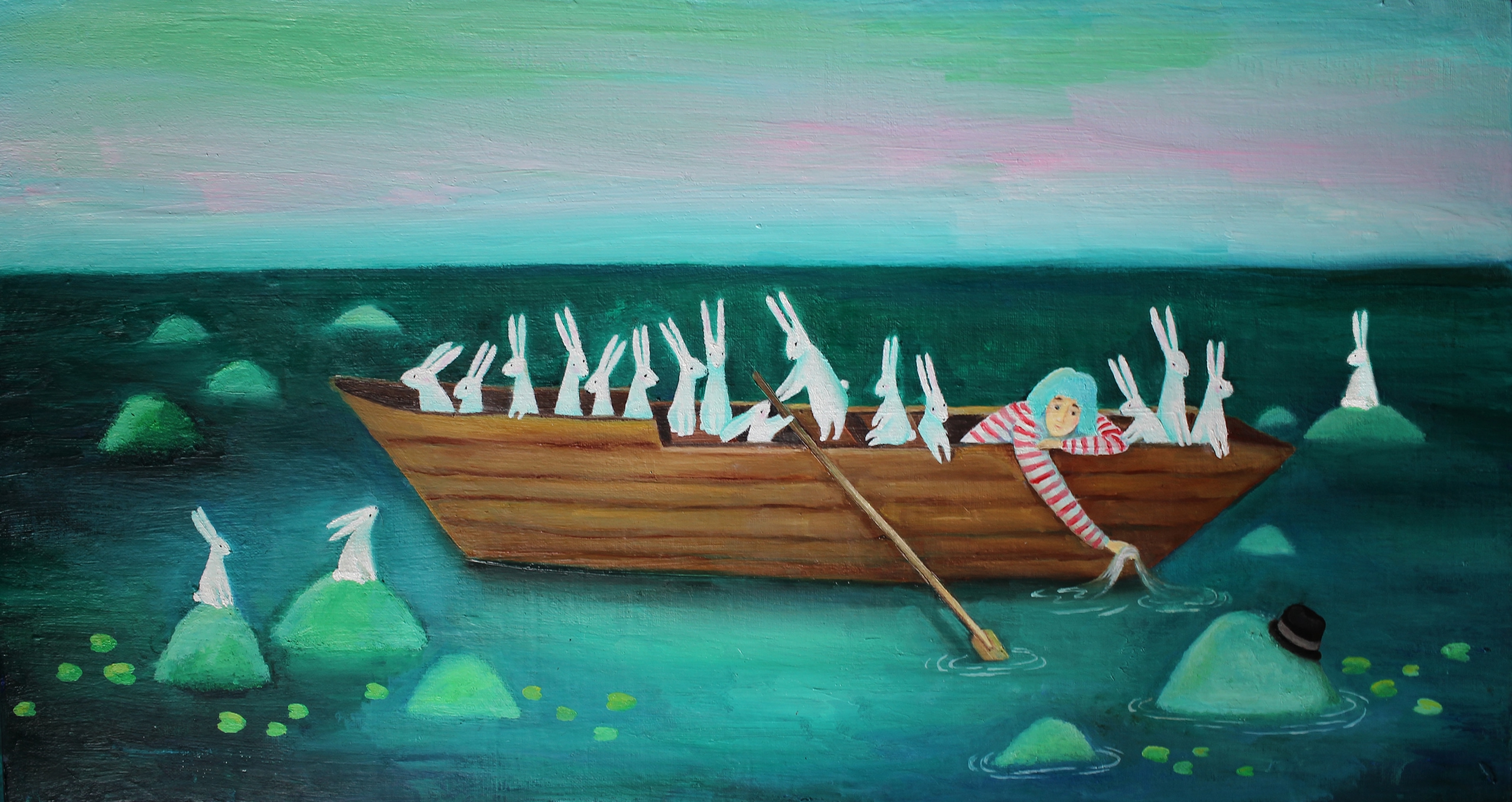Девушка плывёт по течению в лодке с зайцами, картина холст, масло , 2025