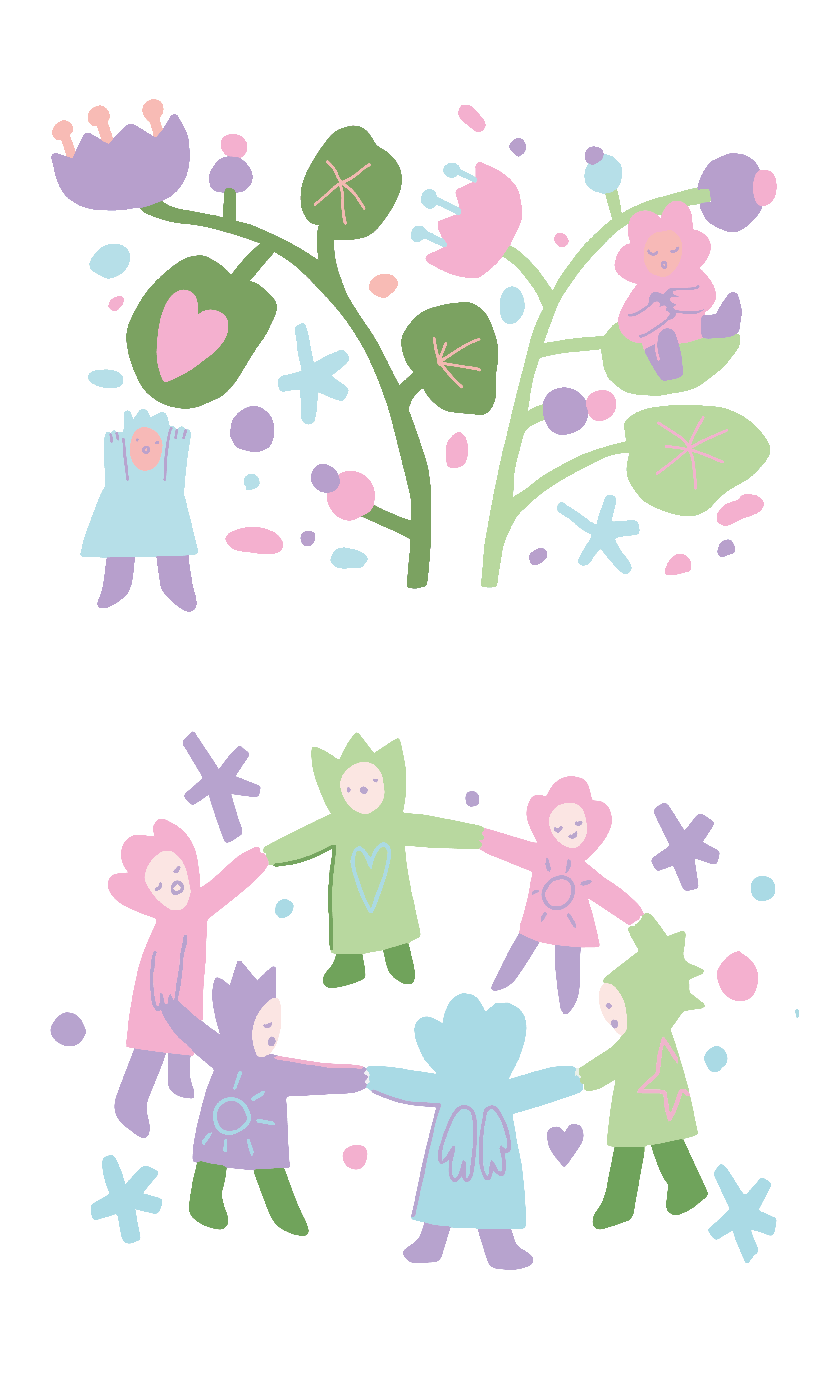 Через целостный художественный образ «сада» в пастельной палитре передать заботу и теплоту. Главные персонажи — хрупкие, но живые цветы, олицетворяющие детей. В сюжетах картинок эти цветы-дети учатся, играют, поддерживают друг друга, проходя путь взросления.