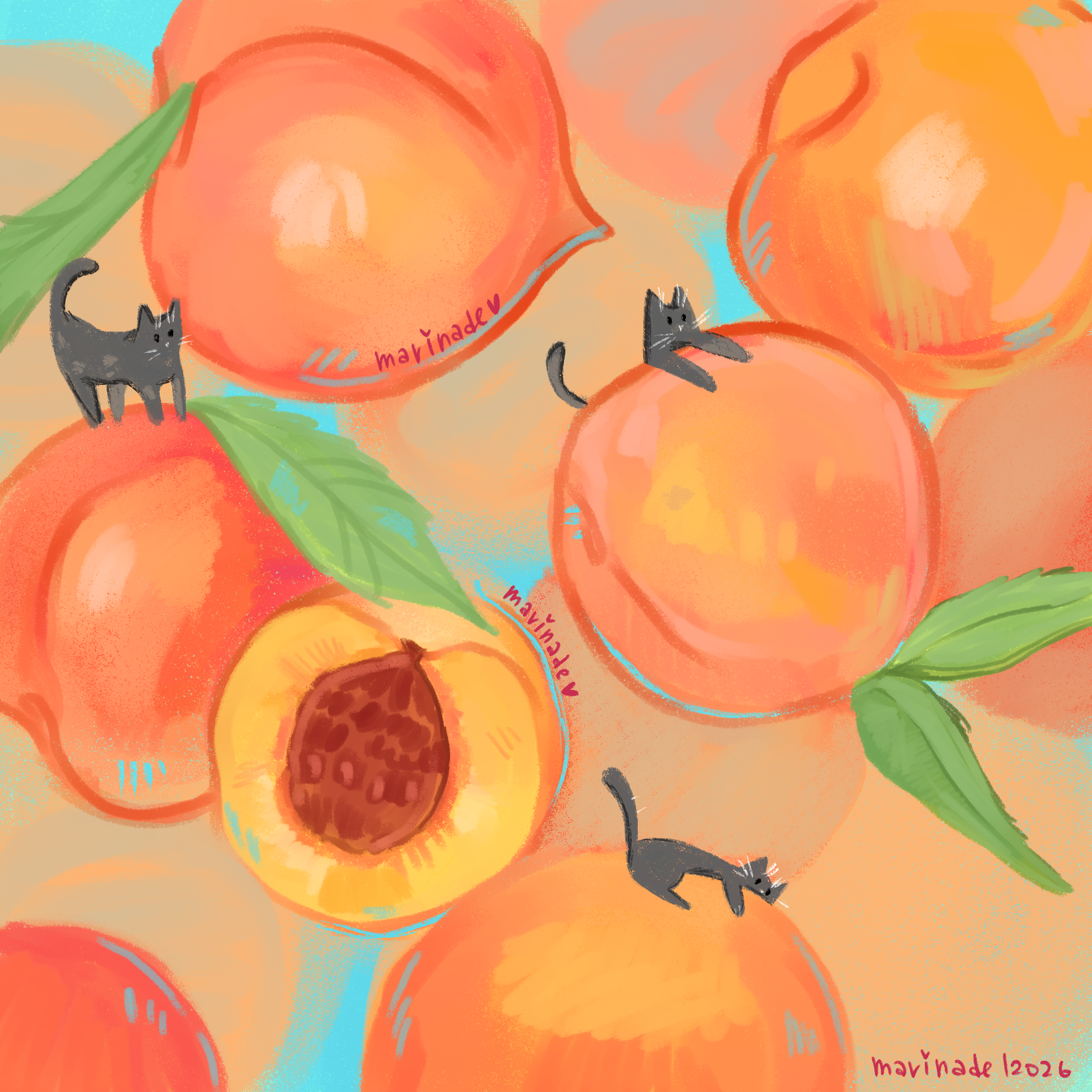 Серия работ о котах и фруктах. Иллюстрации можно применить в разных случаях: как на упаковку, так и на обои для рабочего стола