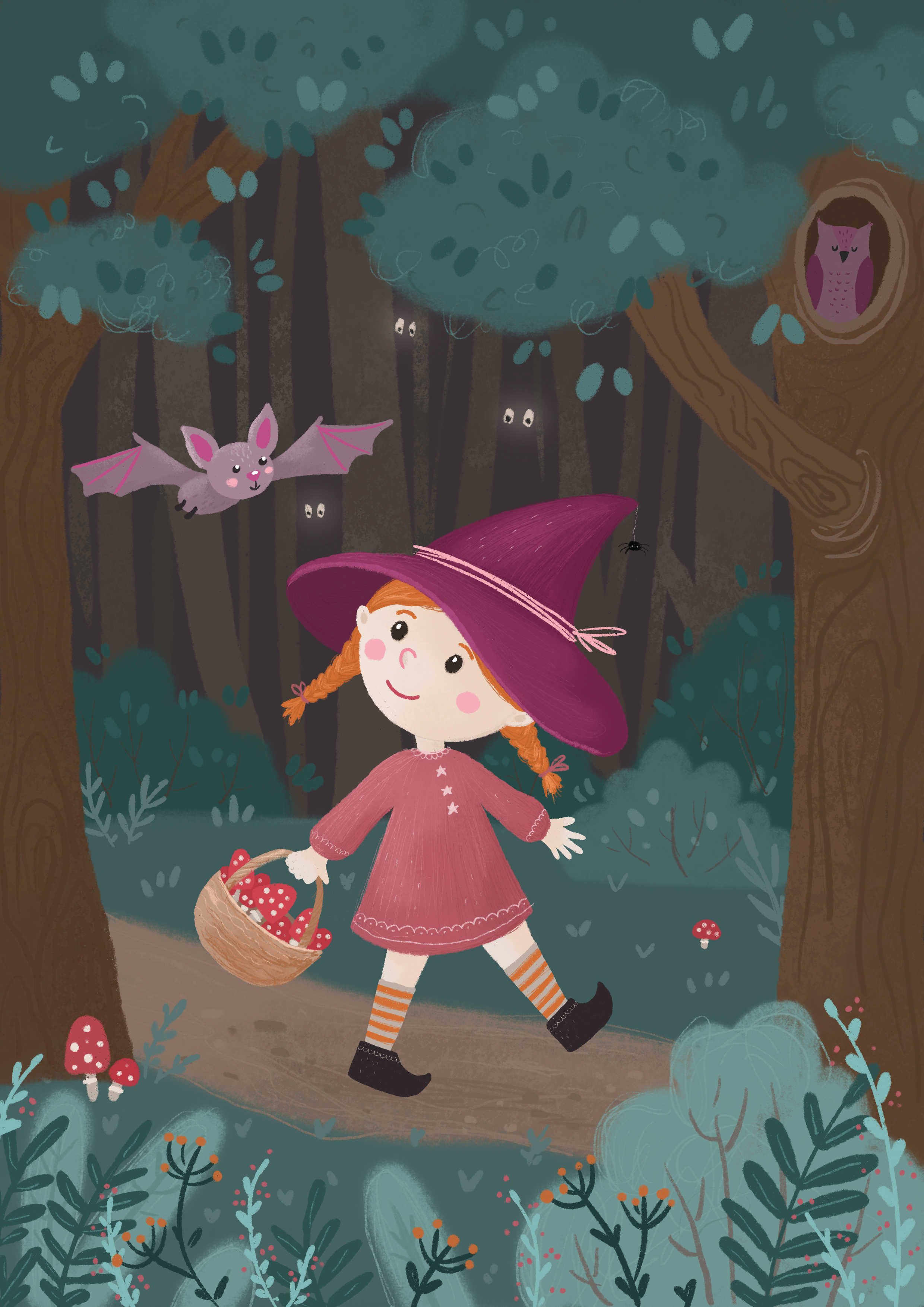 Маленькая ведьмочка отправилась на прогулку по вечернему лесу и собирает грибы.