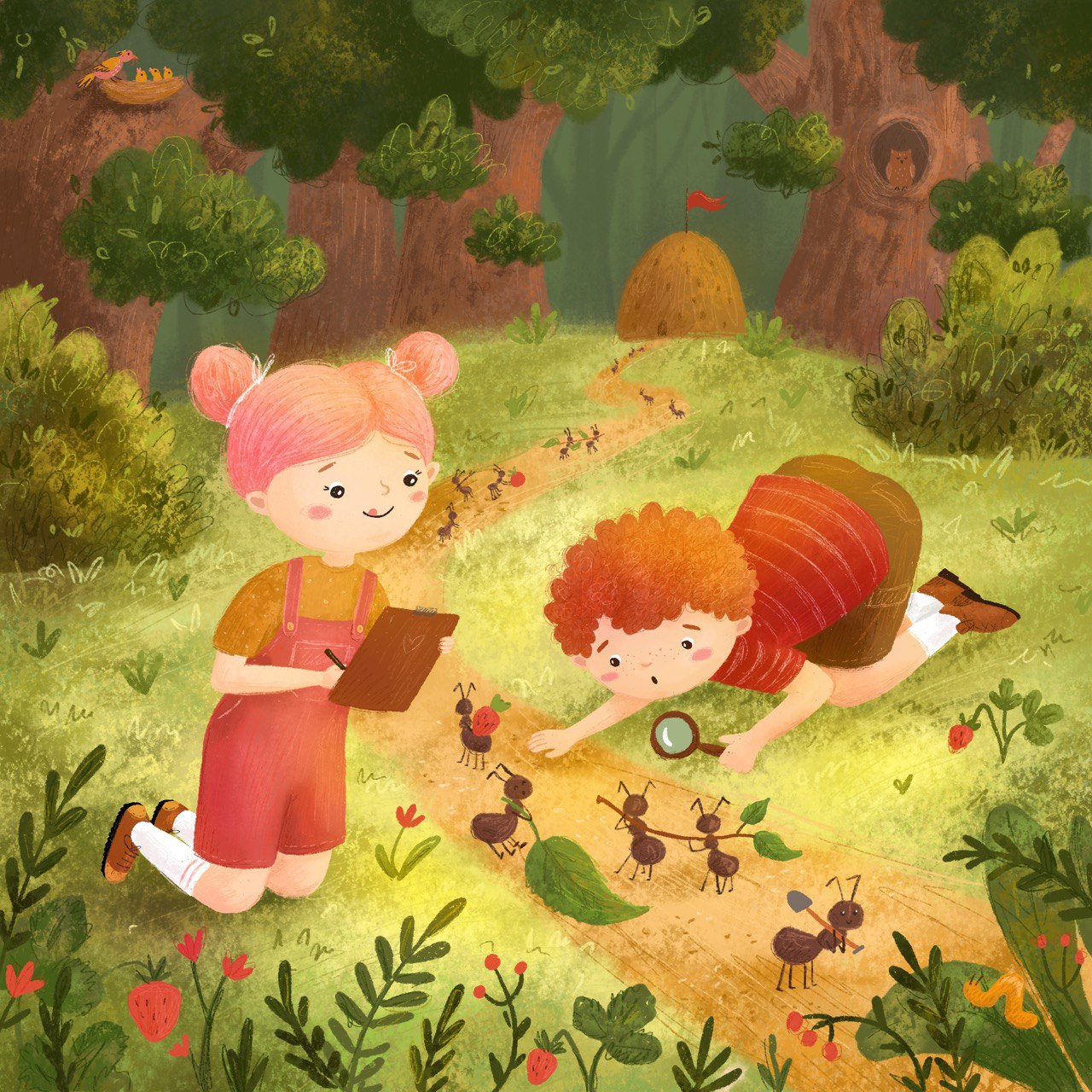 Юные исследователи муравьев — иллюстрация для детской книги
