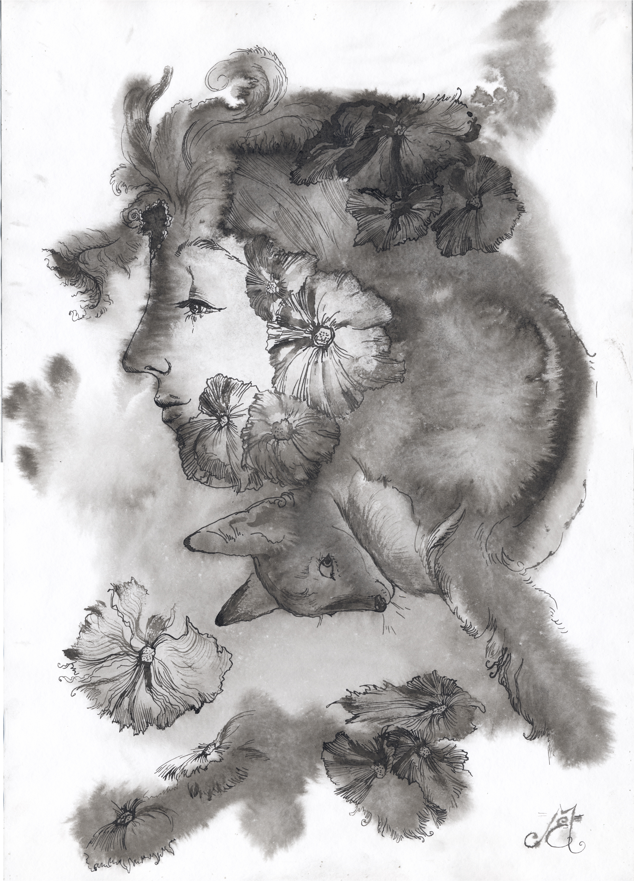 тушь, кисть, вода