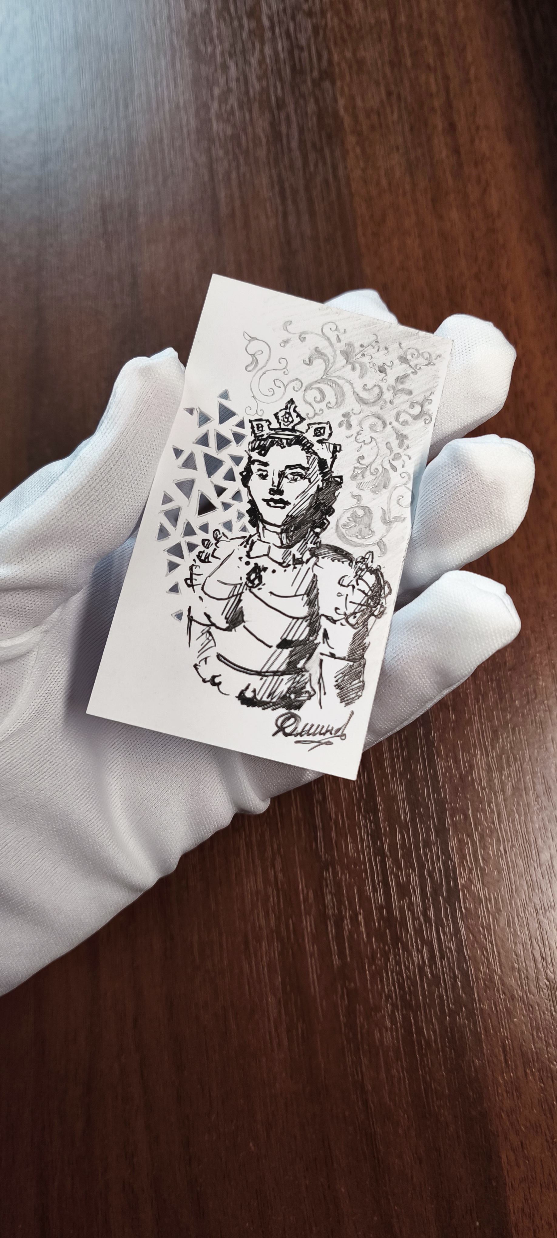 На картонной белой карточке 5 на 9 см рисовал сначала ручкой, потом показалось что нужно добавить узоров, подумав что и этого мало, вырезал треугольники. И вот что вышло в результате небольшого эксперимента.
