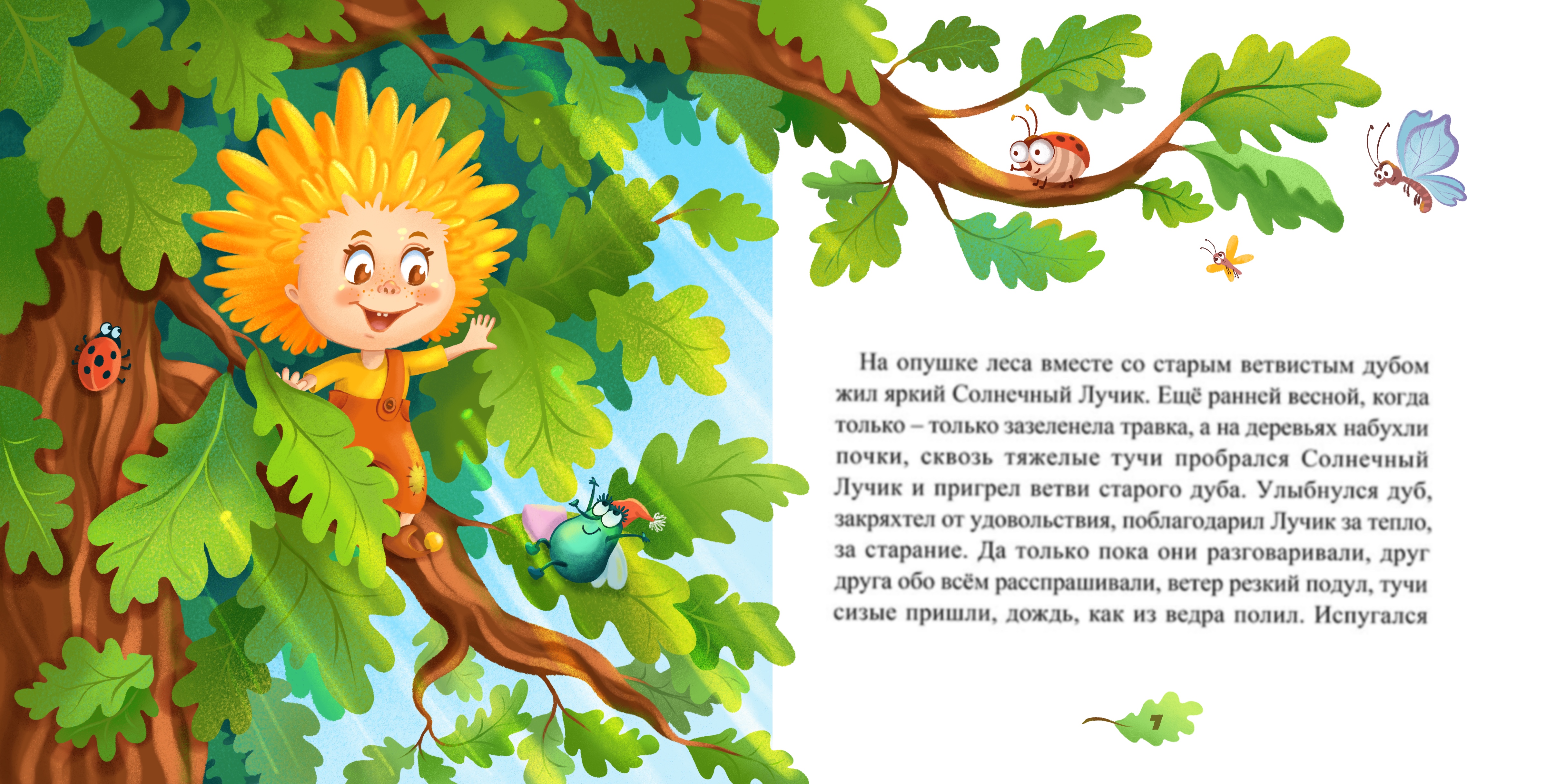Иллюстрация к детской книге для 3-6 лет "Солнечный лучик". Первый разворот - знакомство.