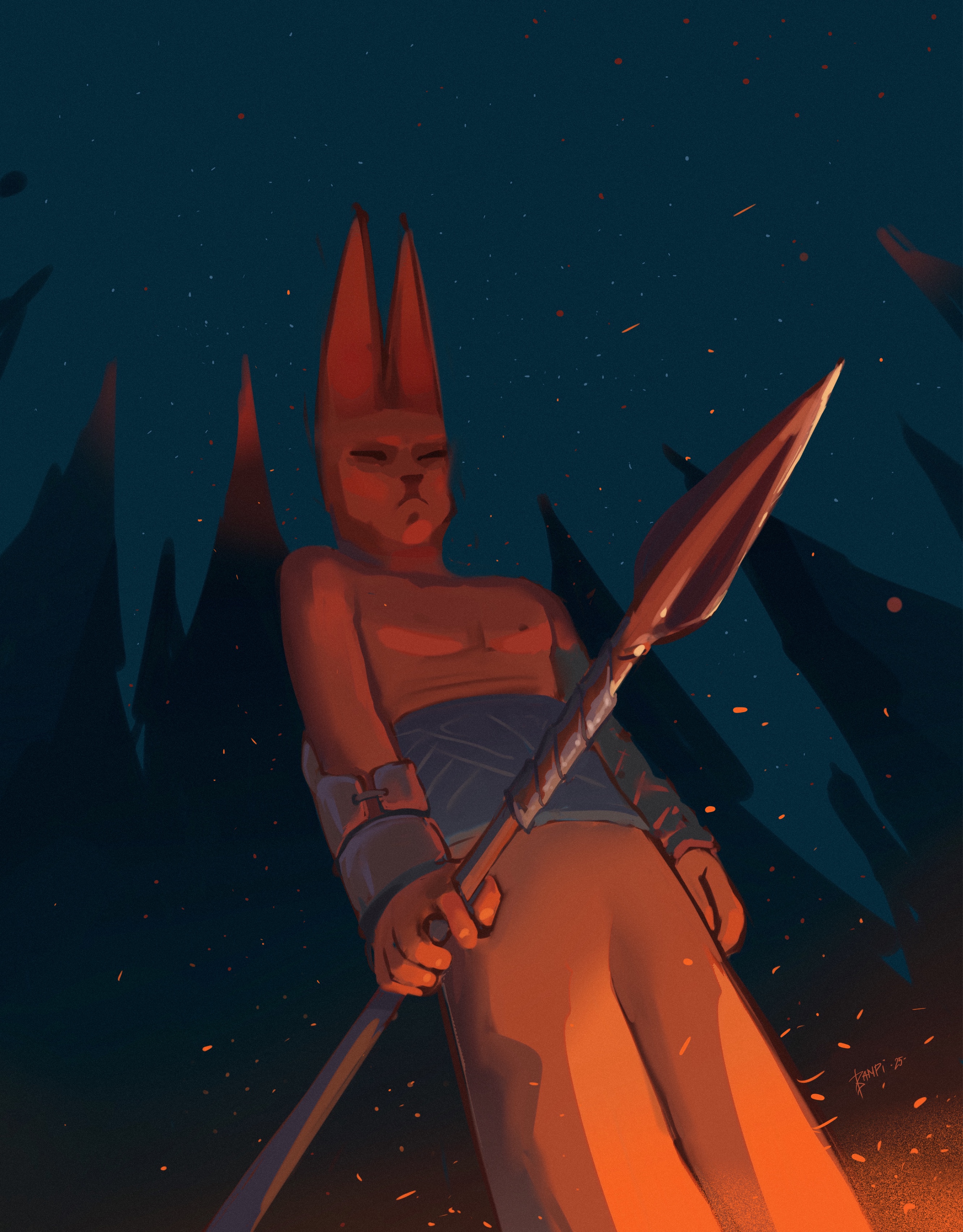 Заяц-воин накануне предстоящей битвы. Смотрит в огонь костра и думает о погибших друзьях, за которых завтра будет мстить.