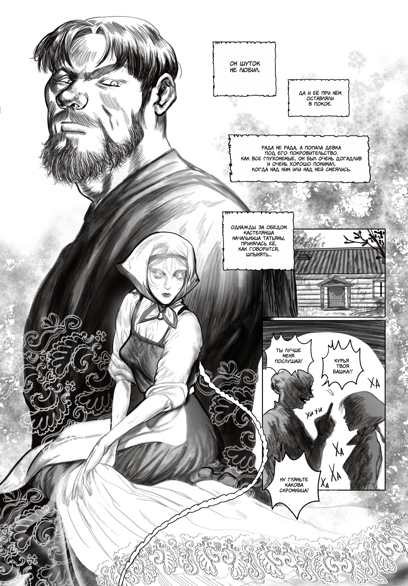 Герасим и Татьяна. Главные персонажи комикса "Муму". Страница из визуальной адапатации классики в комиксах от издательства "Альпака".