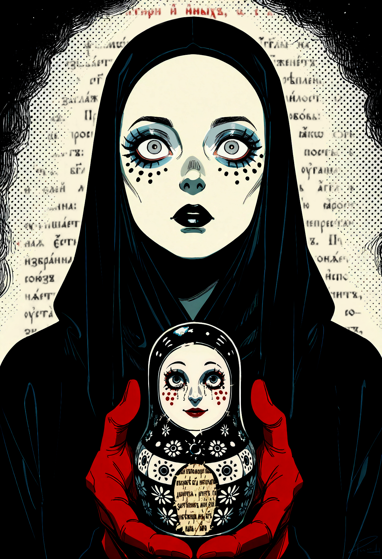 Женщина в чёрном покрывале держит матрёшку, создавая визуальную параллель между внешним и внутренним «я»