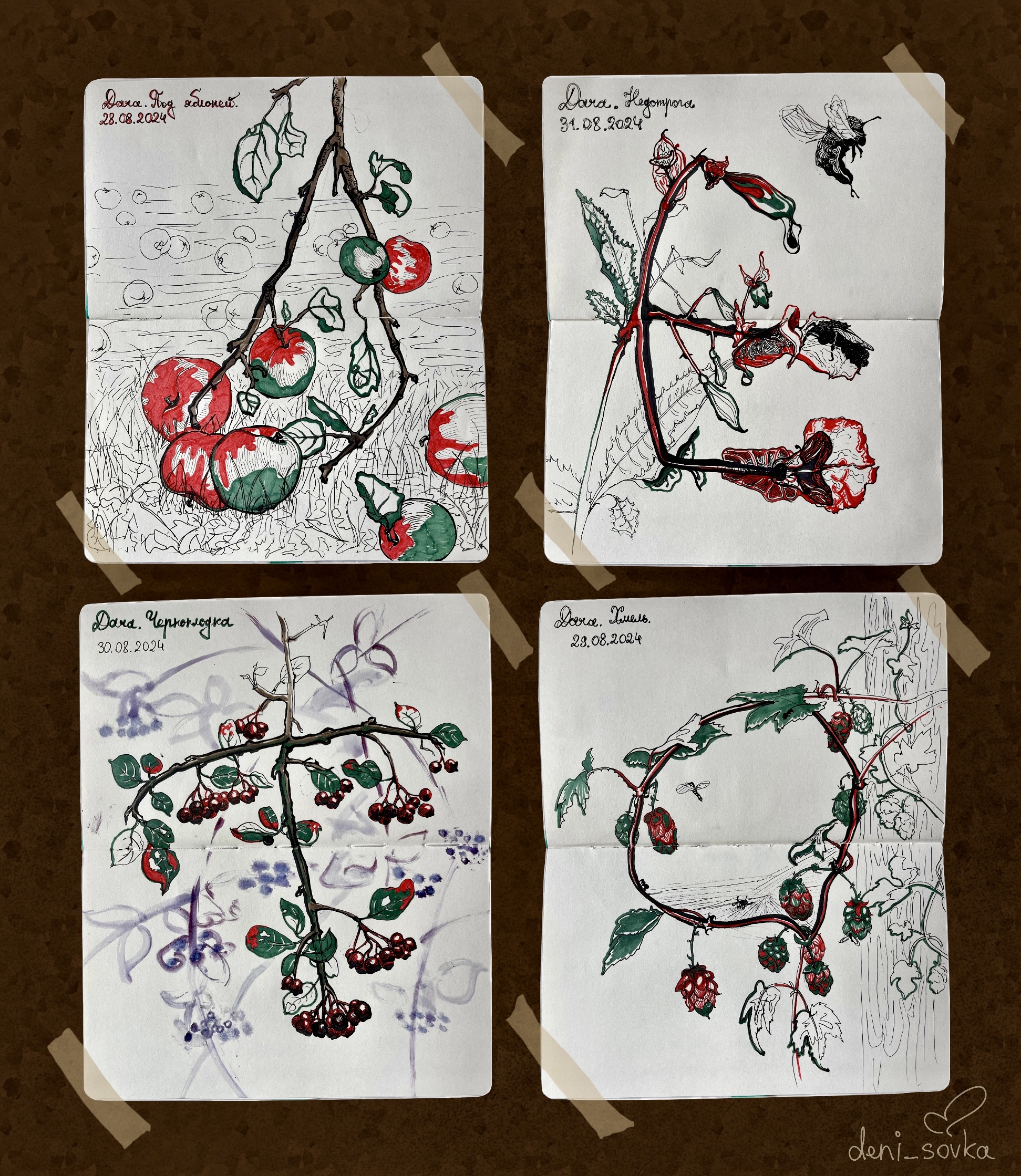 Серия вдохновлена летним сезоном на даче. Рисунки растений выполнены с натуры линером и маркерами.