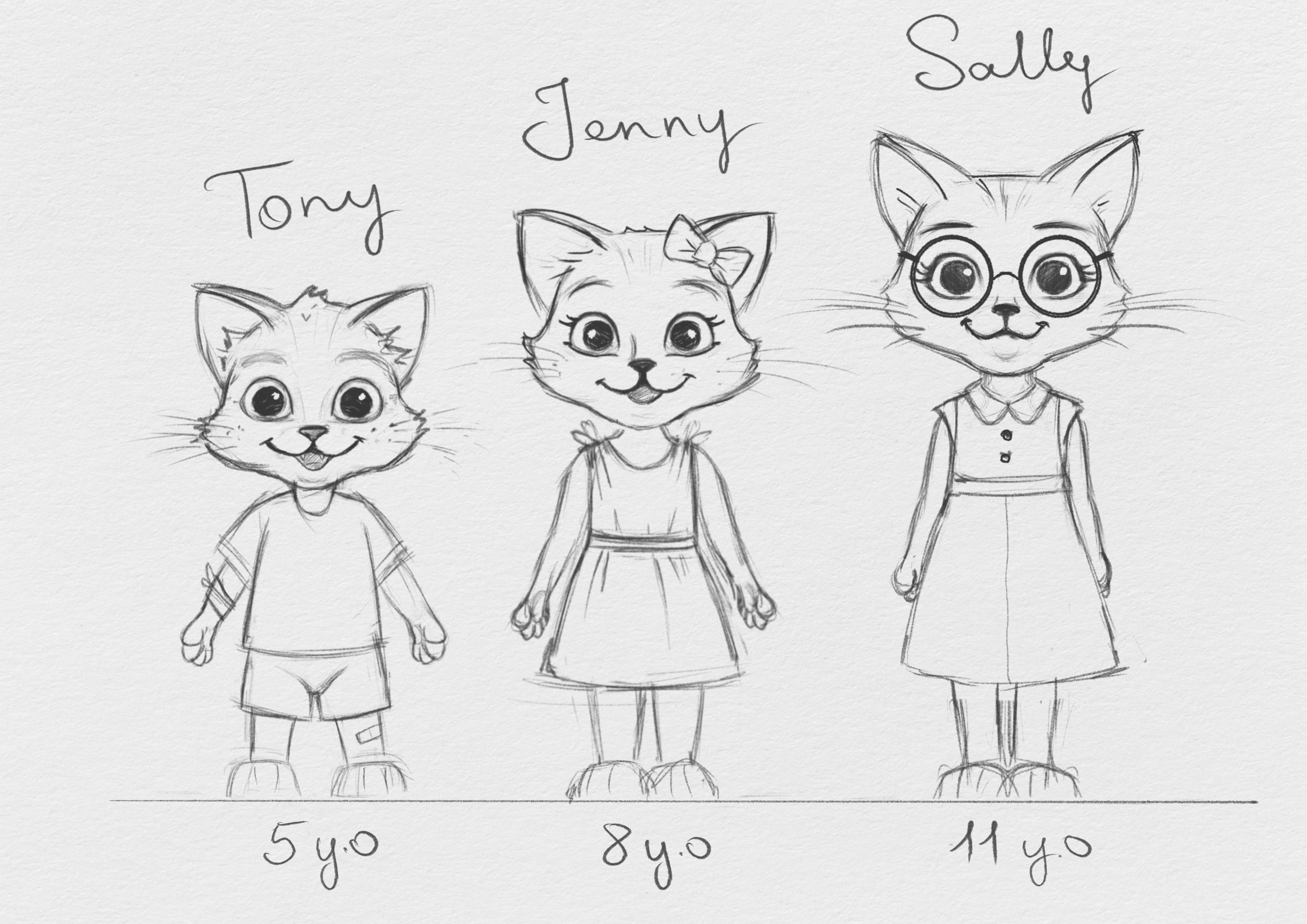 Разработка персонажей, три котенка, эскизы