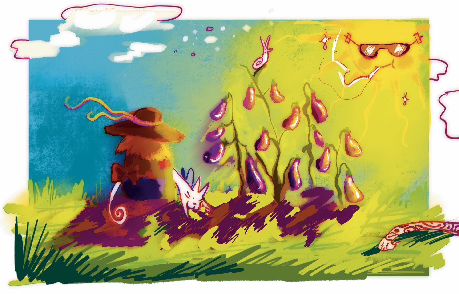 Работа посвящена моей любви к такому продукту как баклажан. Это то, как я представляю своё далёкое будущее. Солнечный денёк, вокруг зверюшки, и поспевшие, озолочённые лучами солнца, баклажаны.