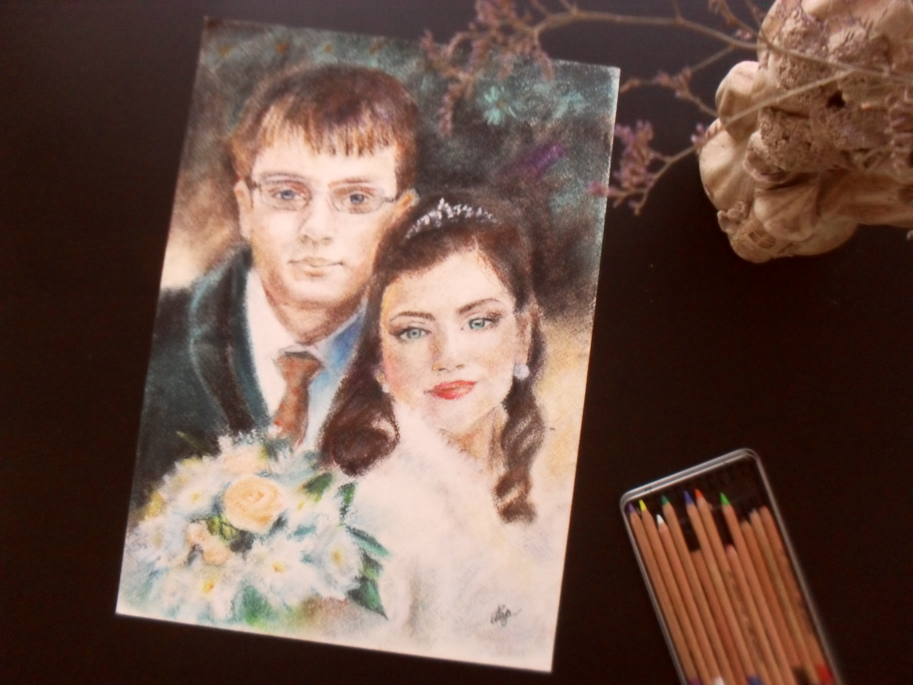 Свадебный портрет формата А3 в технике пастели имеет бархатистую текстуру на плотной бумаге.