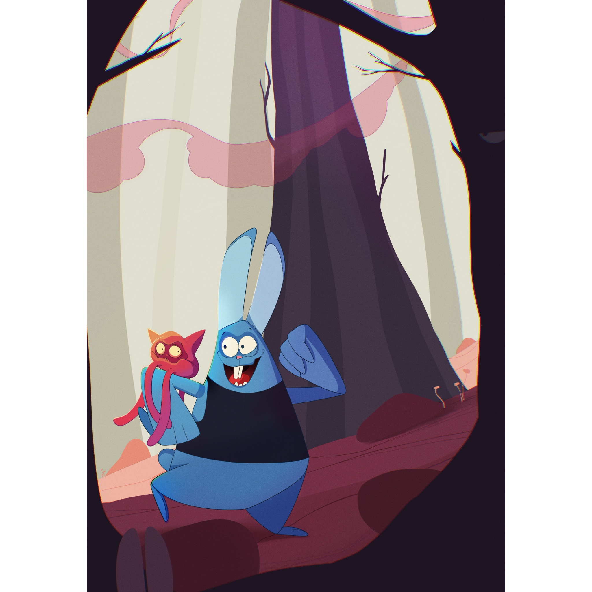 Персонаж кролик и его спутник в лесу. Изначально были придуманы персонажи, затем не сложное окружение.