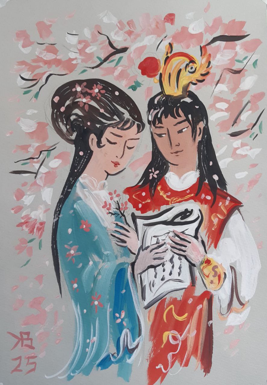 "Сон в красном тереме". Линь Дай-юй и Цзя Бао-юй в персиковом саду.