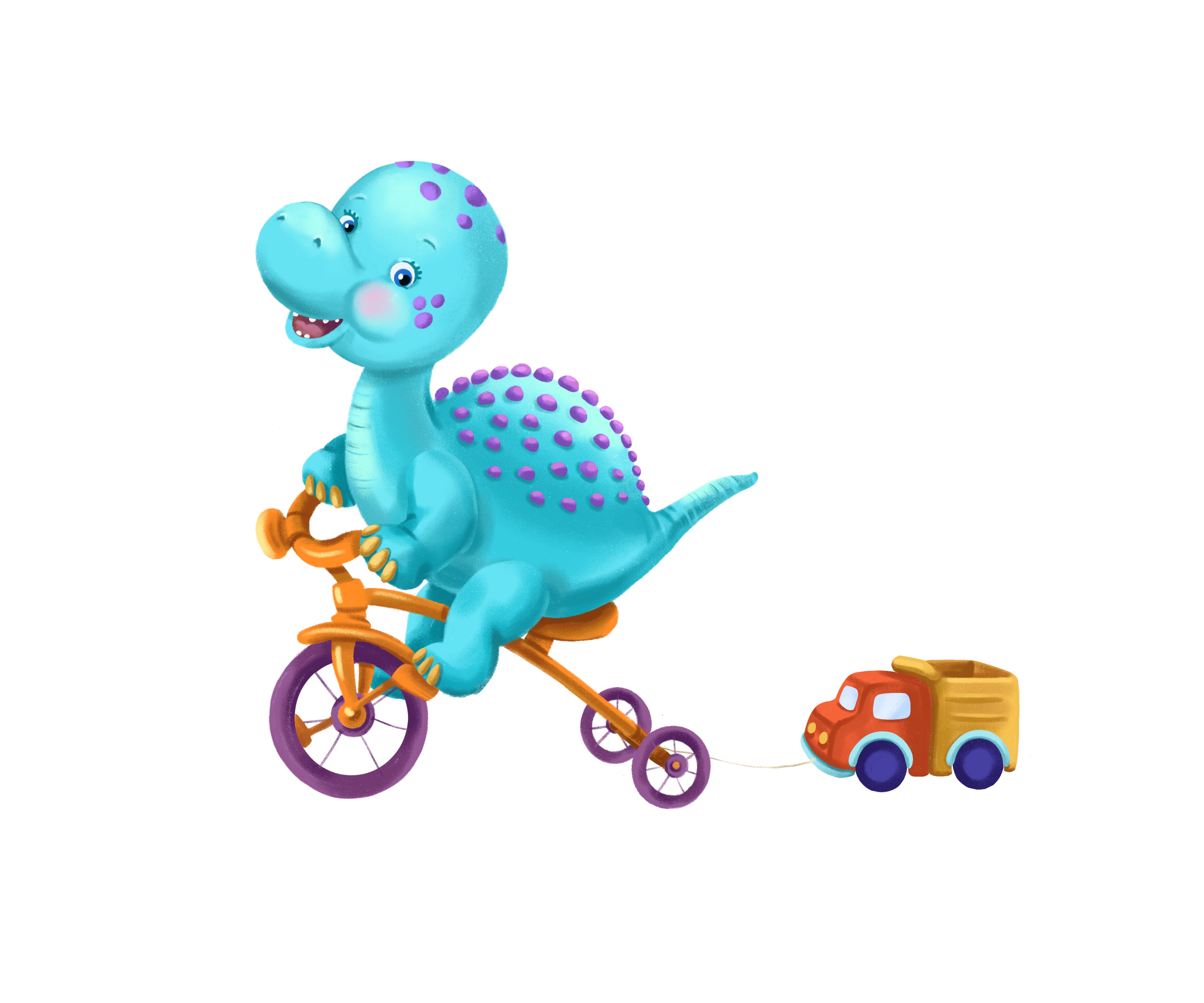На иллюстрации изображен стилизованный малыш динозаврик сальтозавр на велосипеде. Работа выполнена для проекта. Подойдет как иллюстрация для детских карточек, пазлов, обложки книги, календаря, как персонаж для игры-ходилки.