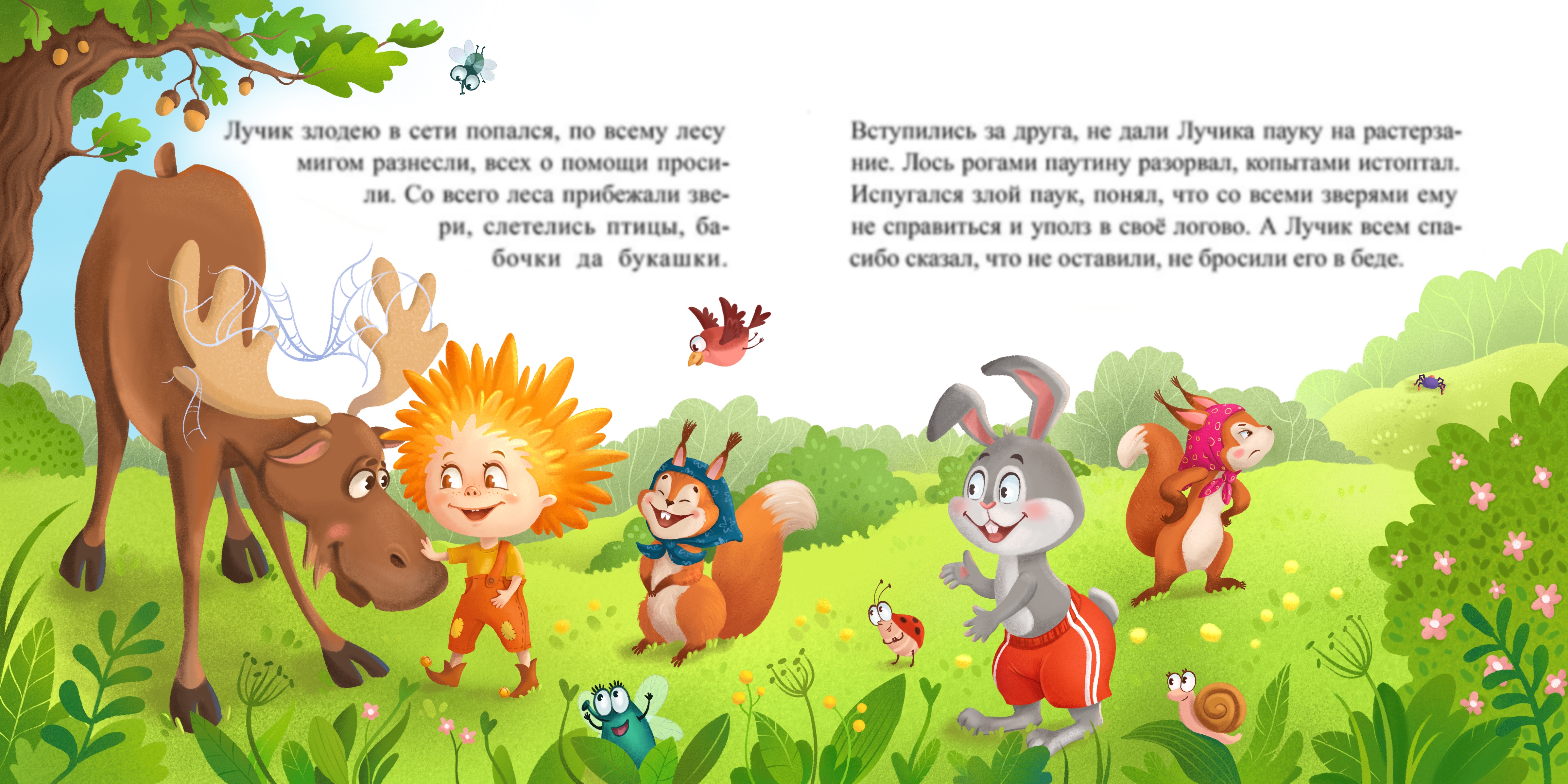Разворот с сценой спасения и благодарности ГГ своими друзьями - зверятами. Светлая теплая гамма выбрана, чтобы подчеркнуть доброту и радость.
