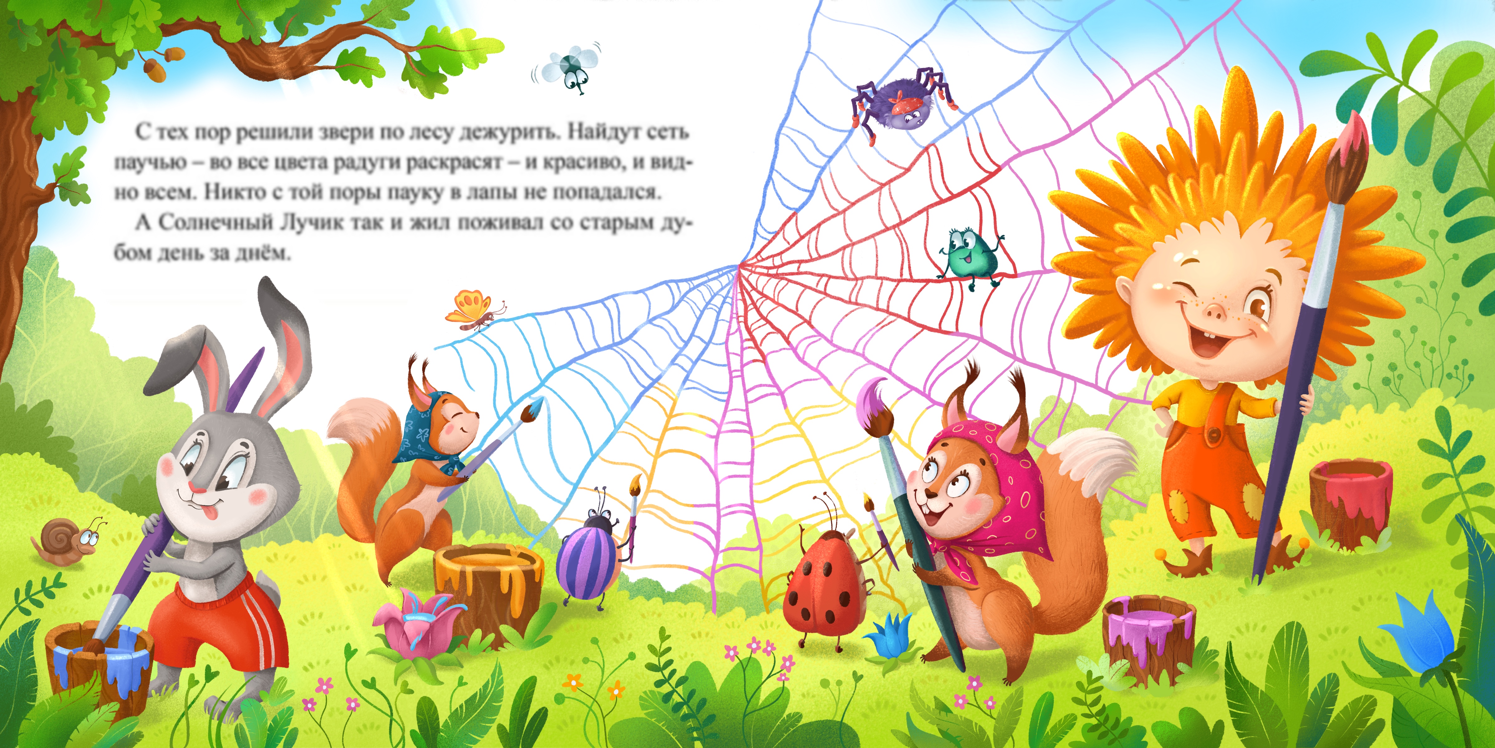 Финальная иллюстрация к детской сказке про Лучика, где герои объединились и решили проблему с паучьими сетями - раскрасить их яркими красками, чтобы никто больше не попался. Сцена яркая, теплая, насыщена персонажами и деталями для разглядывания детьми.