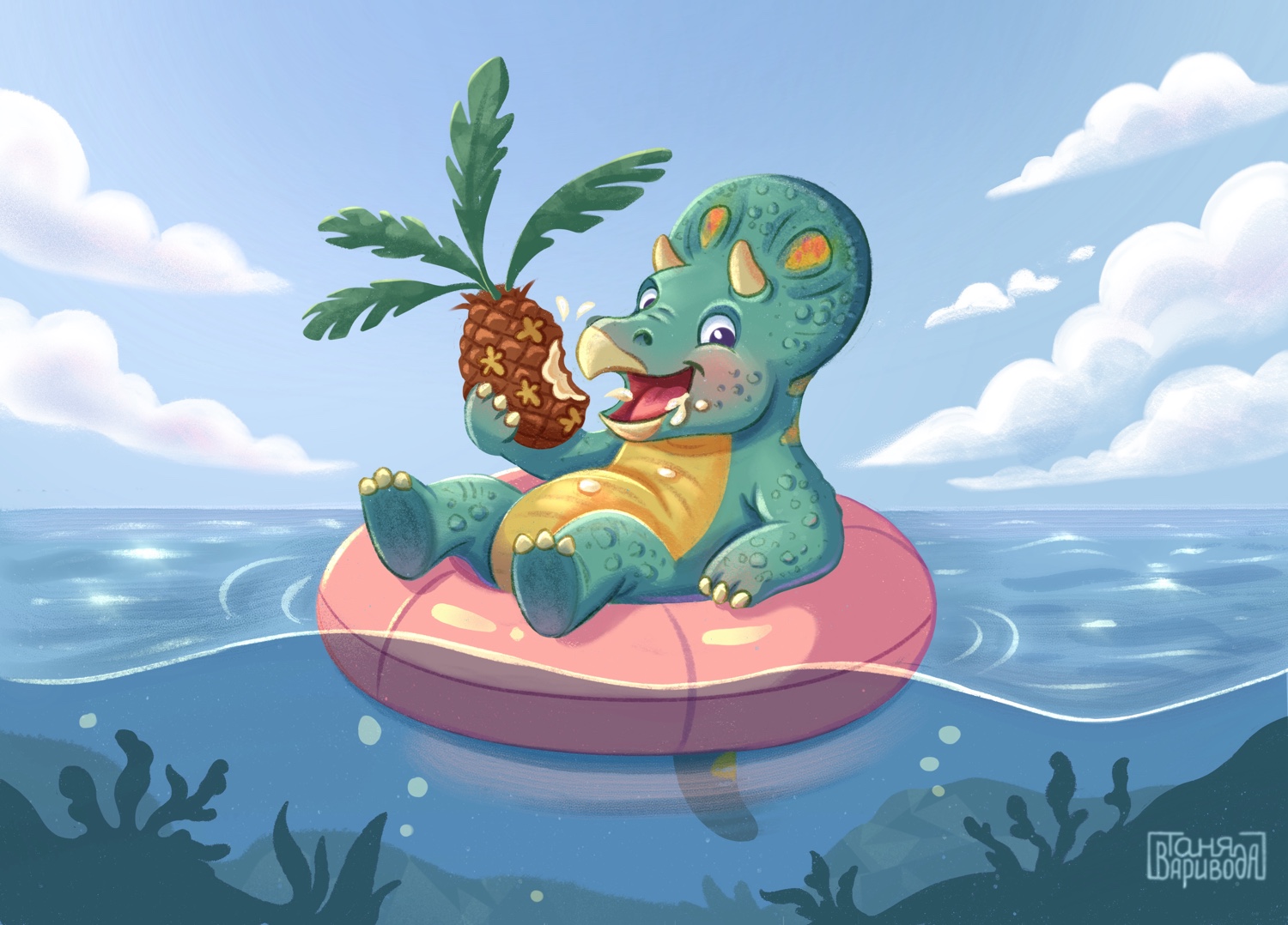 Динозавр наслаждается летним отдыхом на море