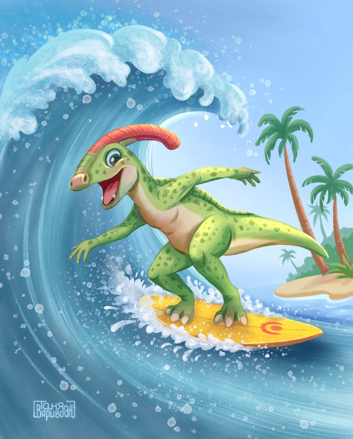 Динозавр-серфингист ловит волну