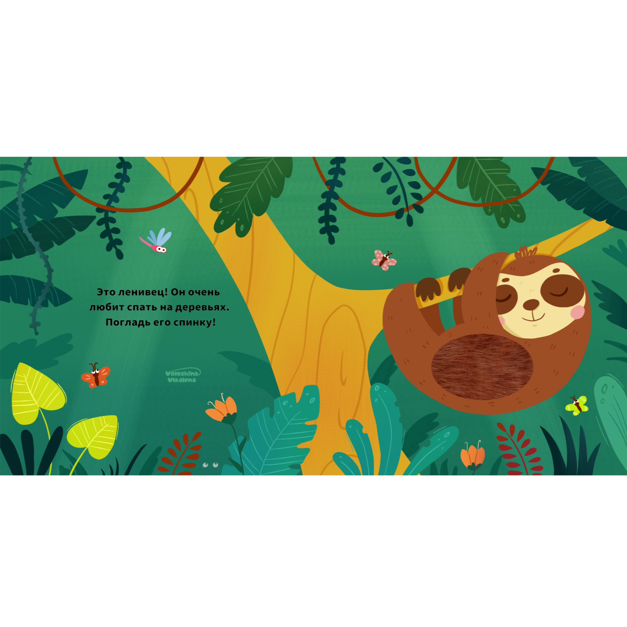 Разворот из тактильной книги для детей. Ленивец висит на ветке