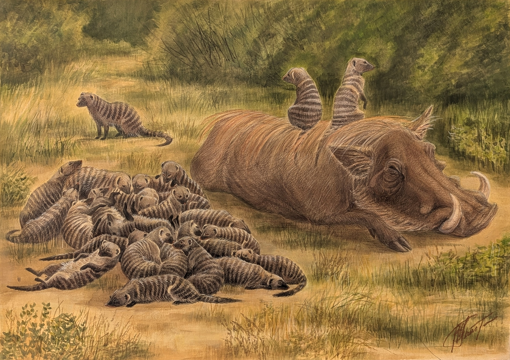 Полосатые мангусты и африканский бородавочник. Симбиоз ради выживания