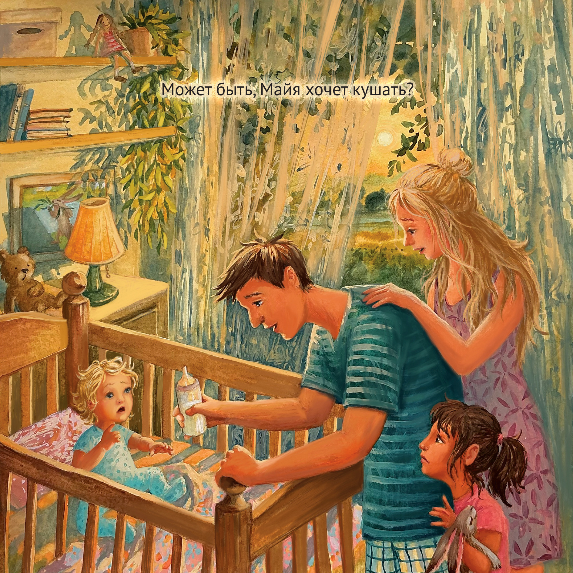 Теплый летний вечер, мама и папа пытаются уложить дочку спать, но она почему то не засыпает ... "Может быть, Майя хочет кушать?" иллюстрация для 3-го конкурса издательства Инопланетянин