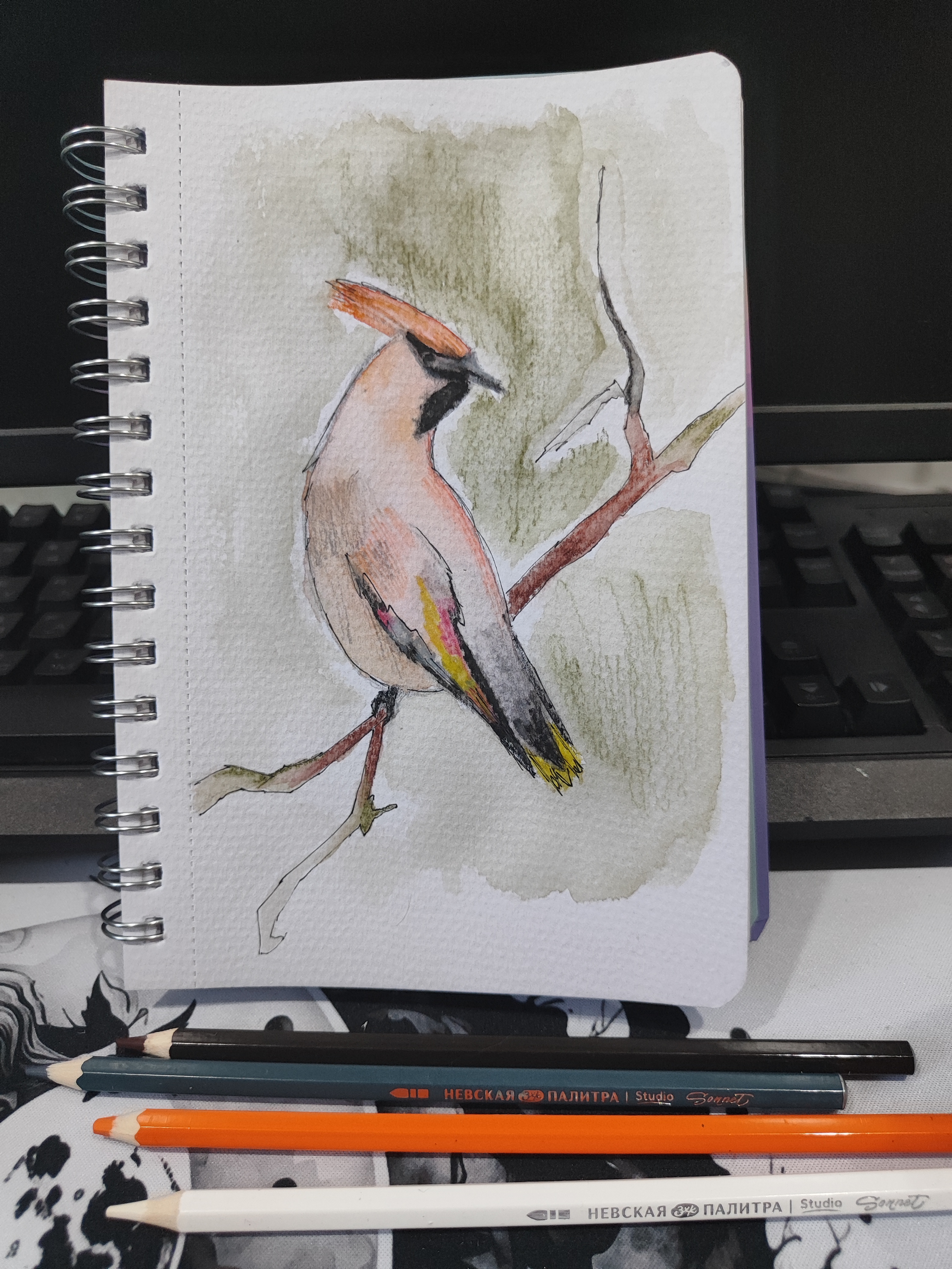 Свиристель акварелью и акварельными карандашами