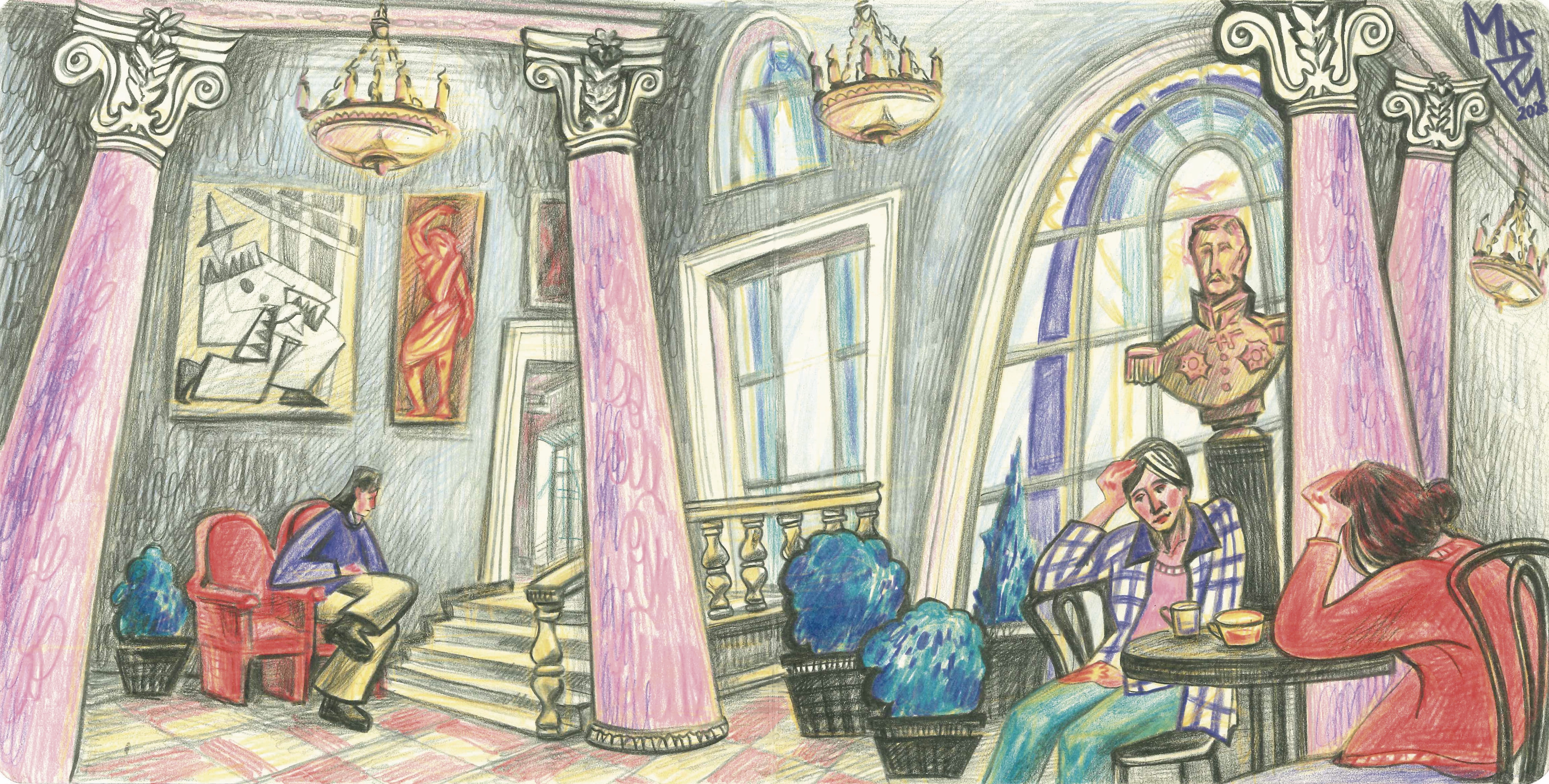 работа из серии зарисовок Строгановской академии. холл помпезно встречает всех входящих красивыми отсветами от витража с гербом и строгим видом бюста графа Строганова. здесь начинаются экскурсии, проходят открытые мероприятия, вечерами бывает проводятся студенческие празднования.