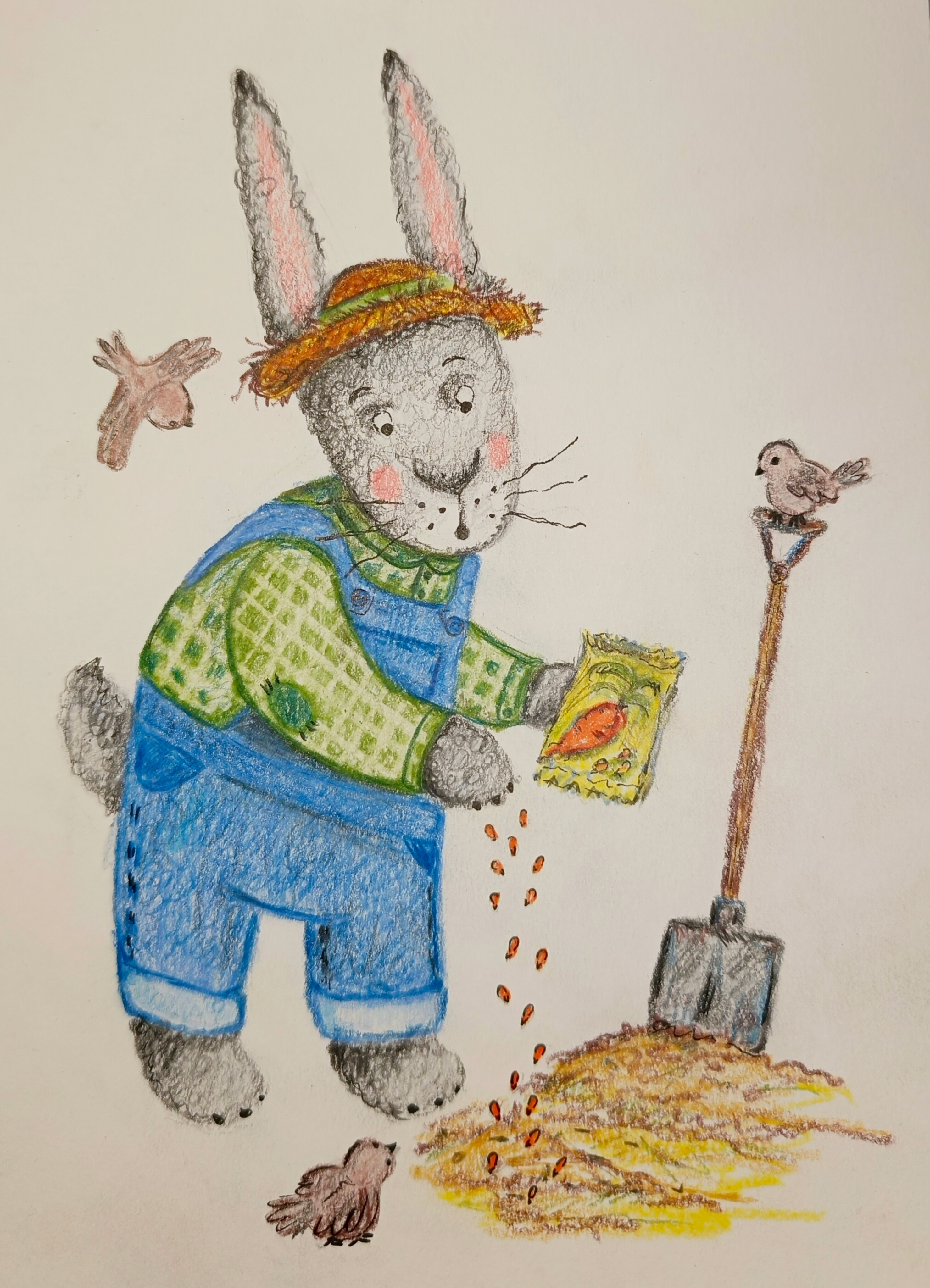 Зайка грезит о сладкой морковке. Но есть одно "но": не одни мы мечтаем о вкусненьком. Воробьишки тоже не прочь полакомиться, и их мечты – о хрустящих семечках.