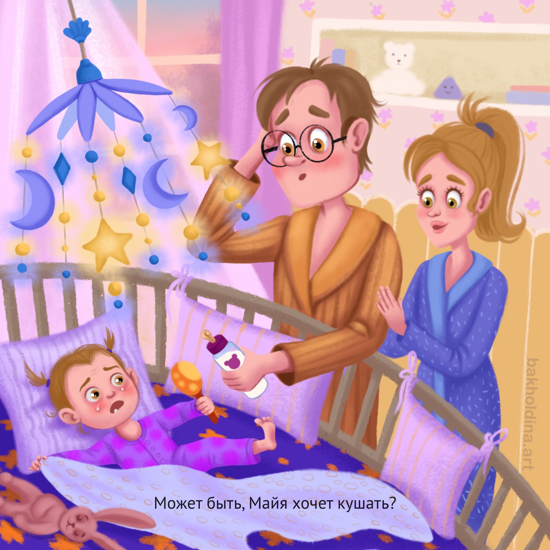 Майя, шестимесячный ребенок, плачет. Родители пытаются угадать причину. Может быть, Майя хочет кушать?