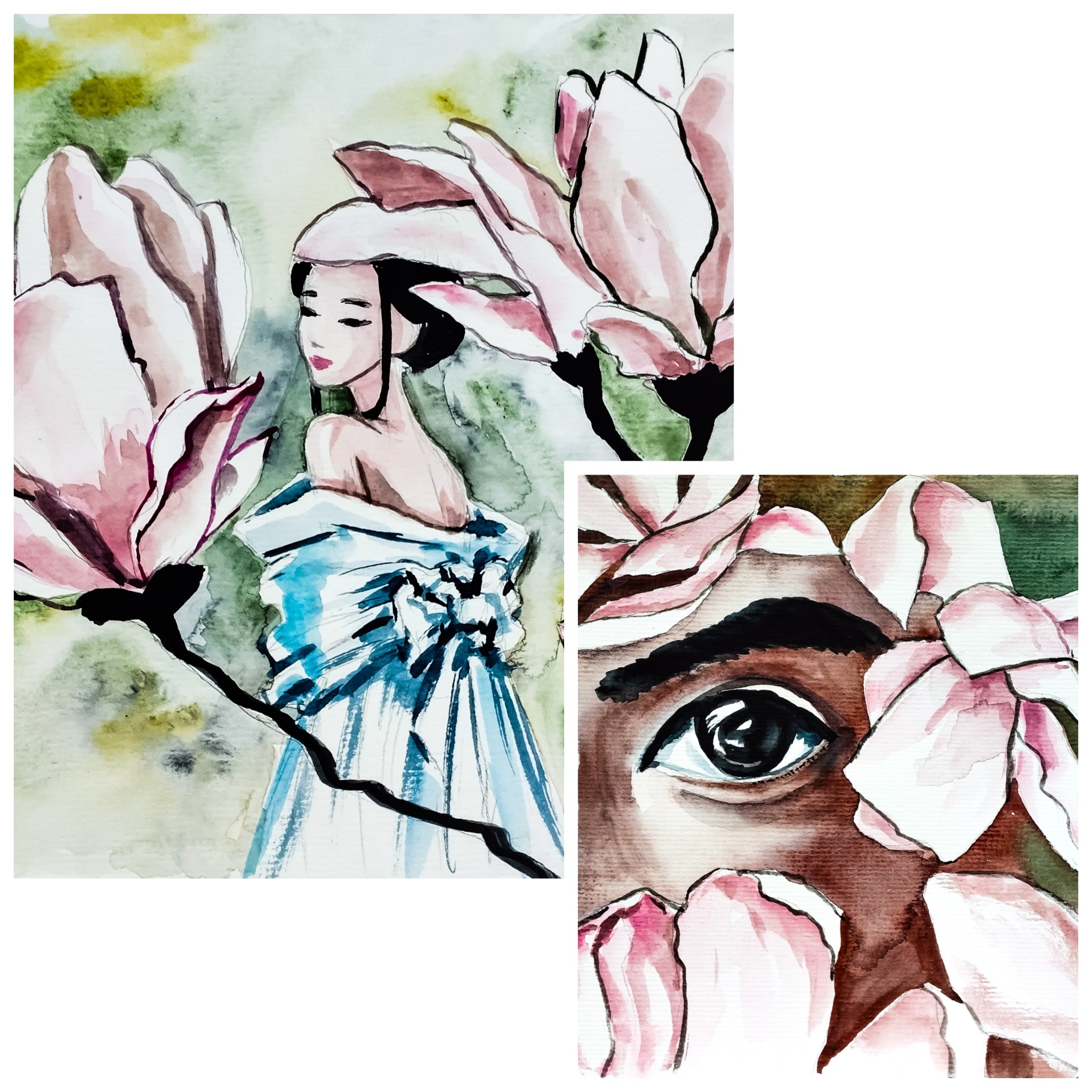 Акварельный диптих о двух людях, которые никогда не встретятся — но существуют в одном цветущем мире магнолий.