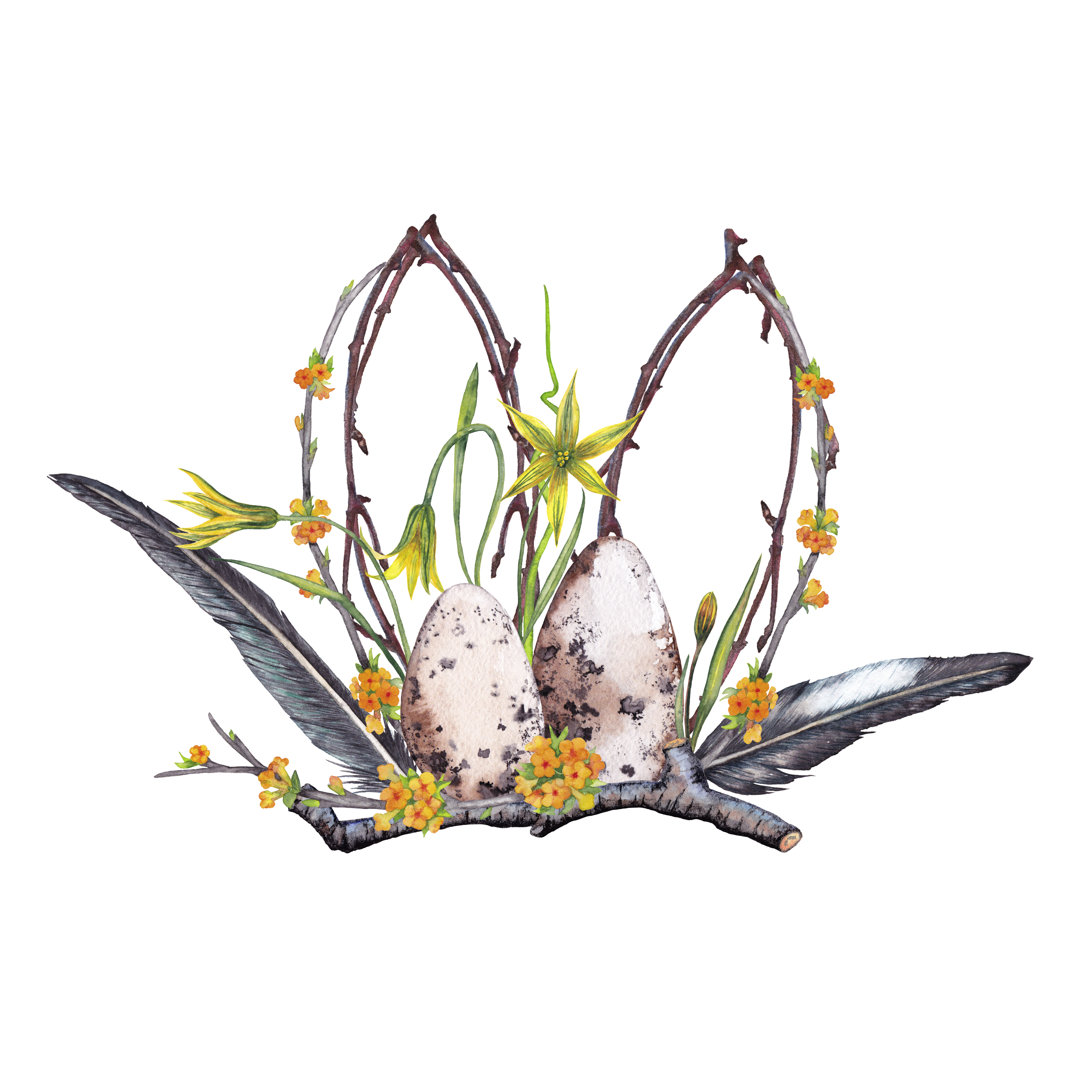 Композиция из лесных весенних цветов и веточек с перьями и яйцами диких птиц. Нарисованная вручную акварель. Цифровой файл для печати ( .jpg .png)